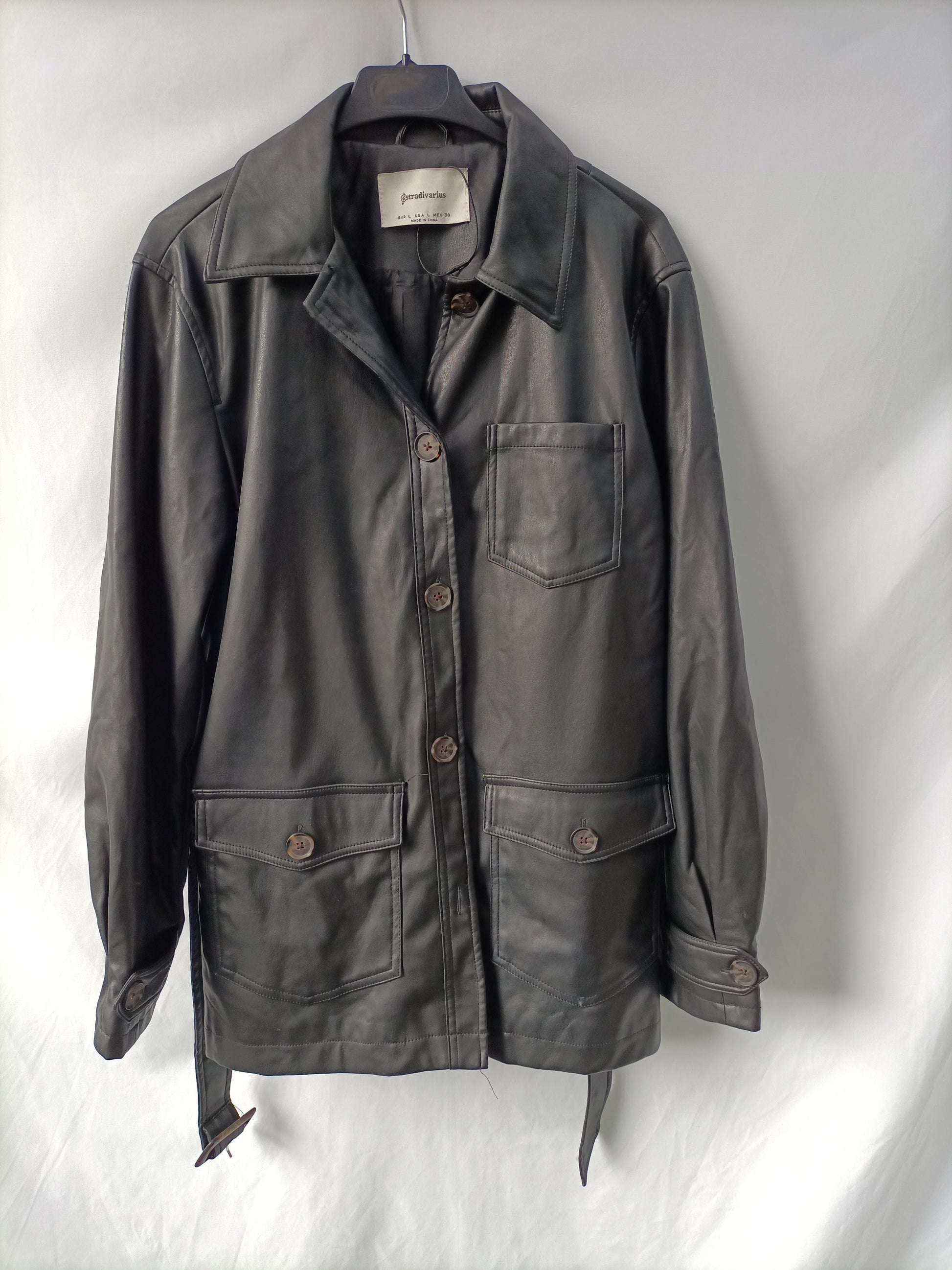 Chaqueta negra efecto piel con cinturón. De sisa a sisa 51 cm largo 77 cm