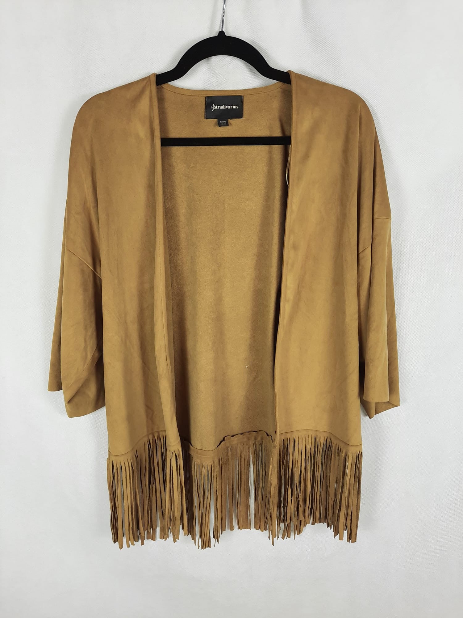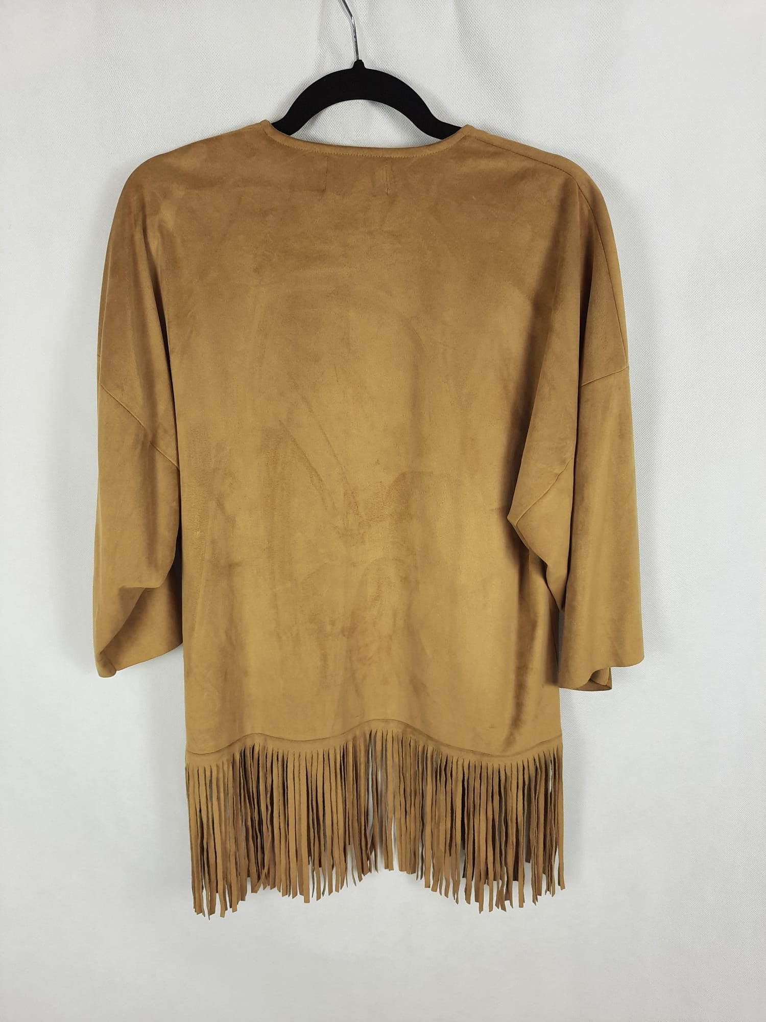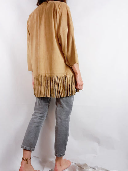 Chaqueta de antelina con flecos, es finita y fluida. Manga ancha 3/4. Largo 76 cm