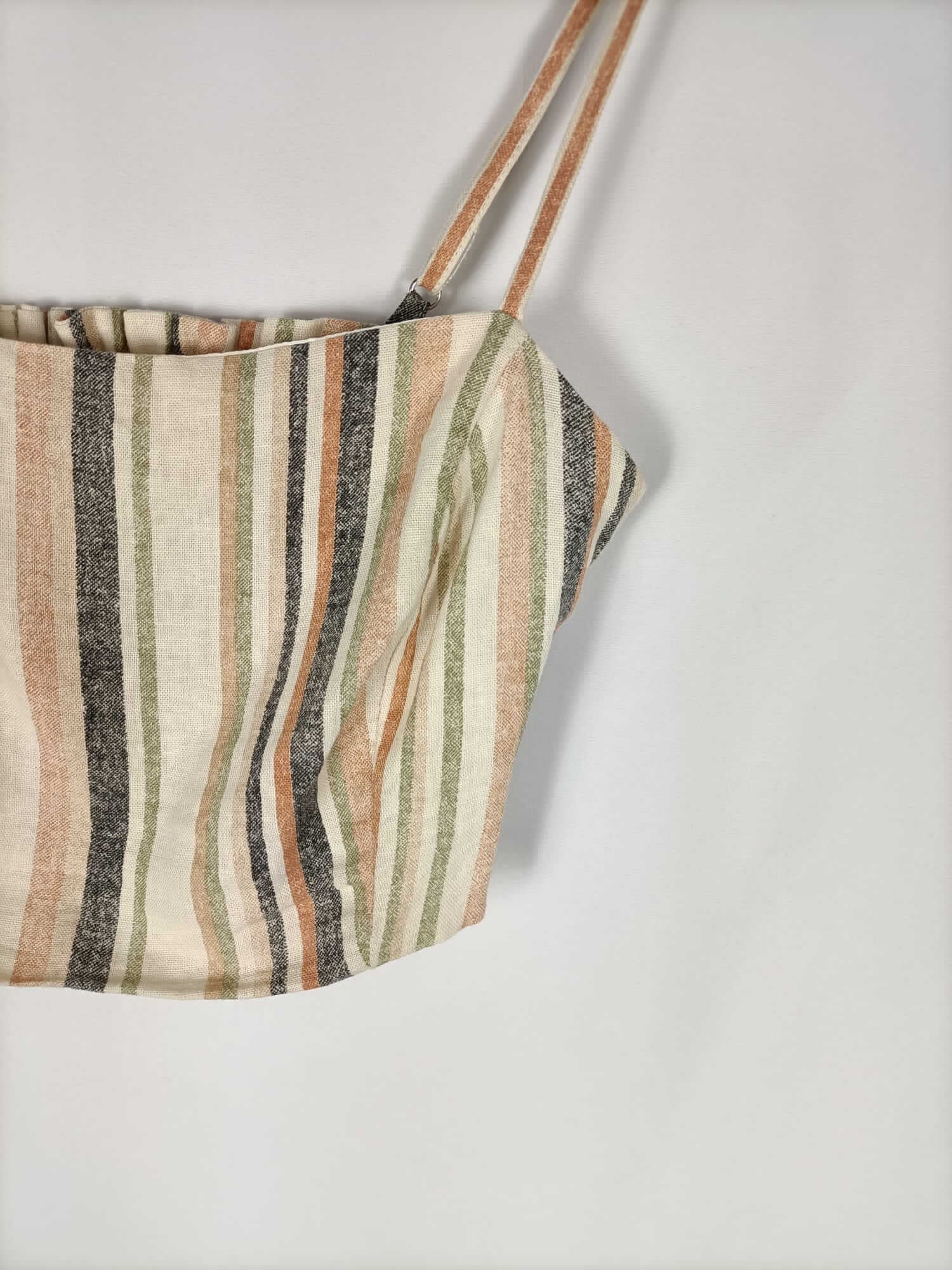 Stradivarius. Top de rayas en tono pastel de tejido tipo lino. Espalda elástica y tirantes ajustables. Largo 32 cm