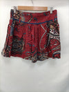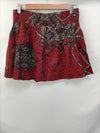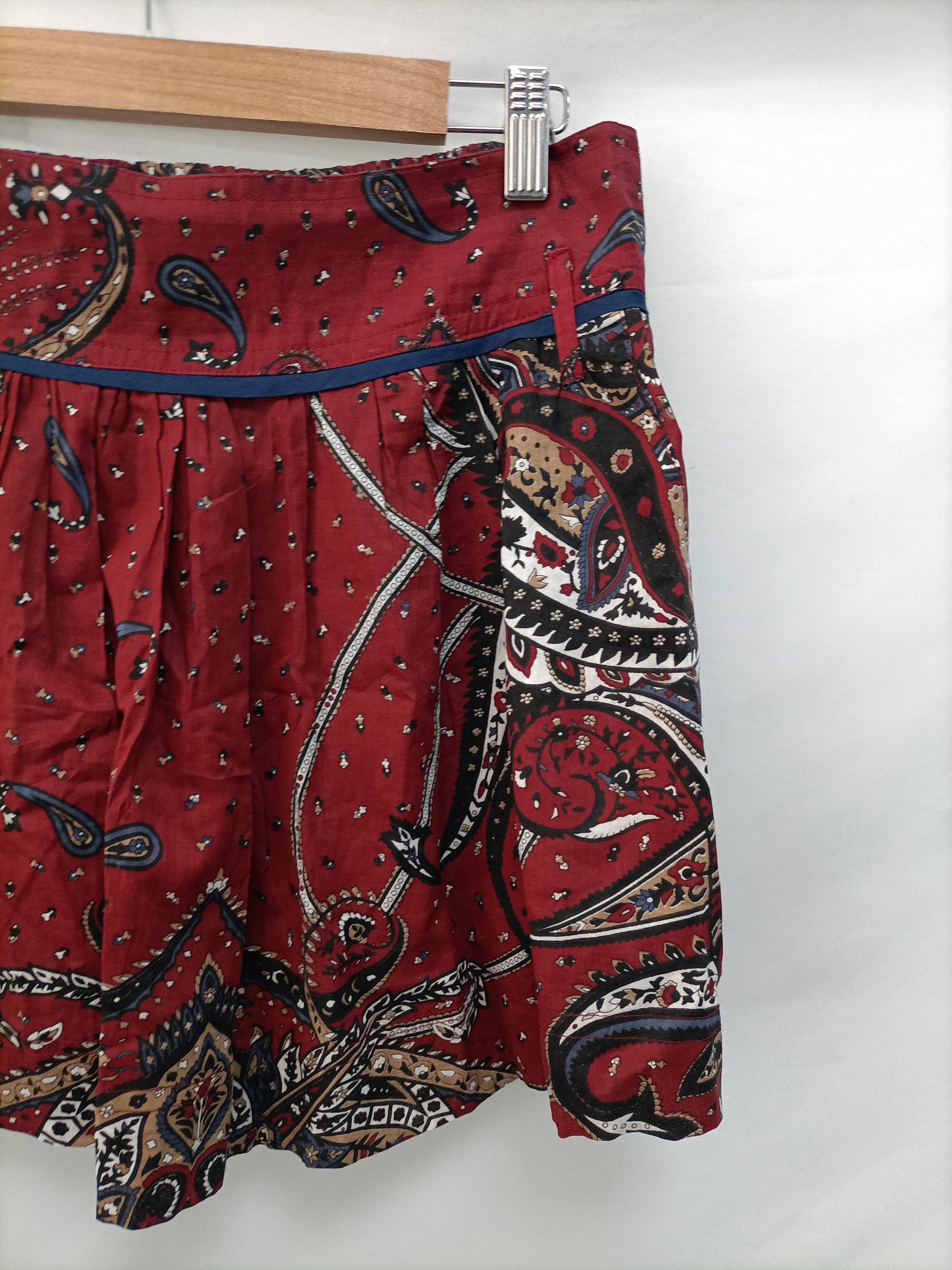 Falda burdeos con estampado de flores. Cintura elástica por la espalda. Tiene bolsillo. Corta con vuelo. Largo 39 cm