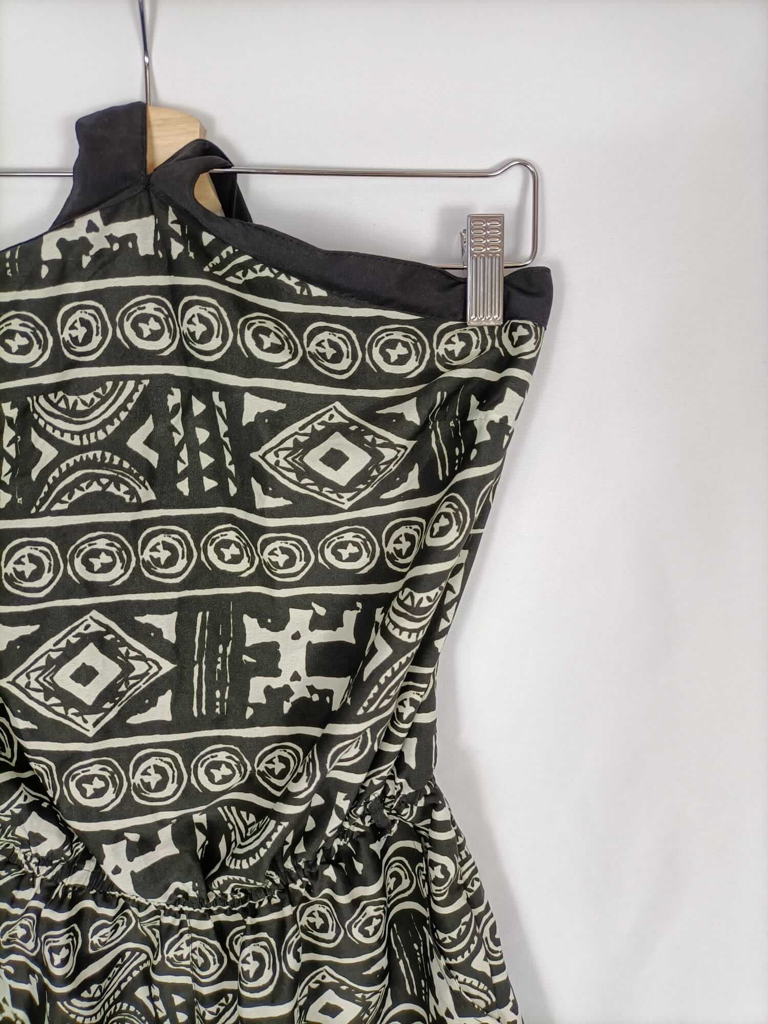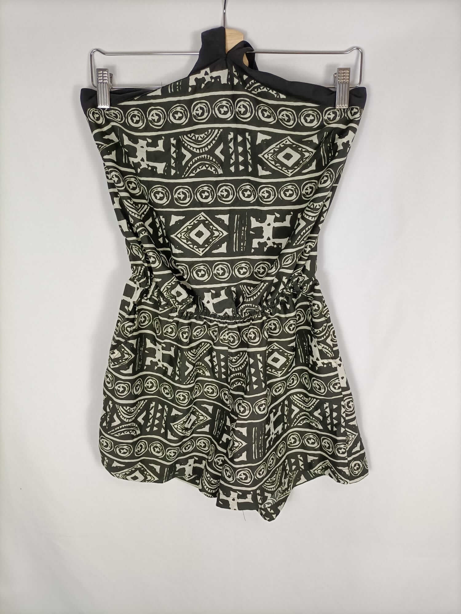Stradivarius. M. Mono corto negro y beige con estampado étnico. Atado al cuello. Cintura elástica. Largo 60 cm