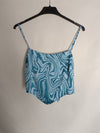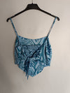 top azul con rayas onduladas. Espalda elástica con lazada y tirantes ajustables.
