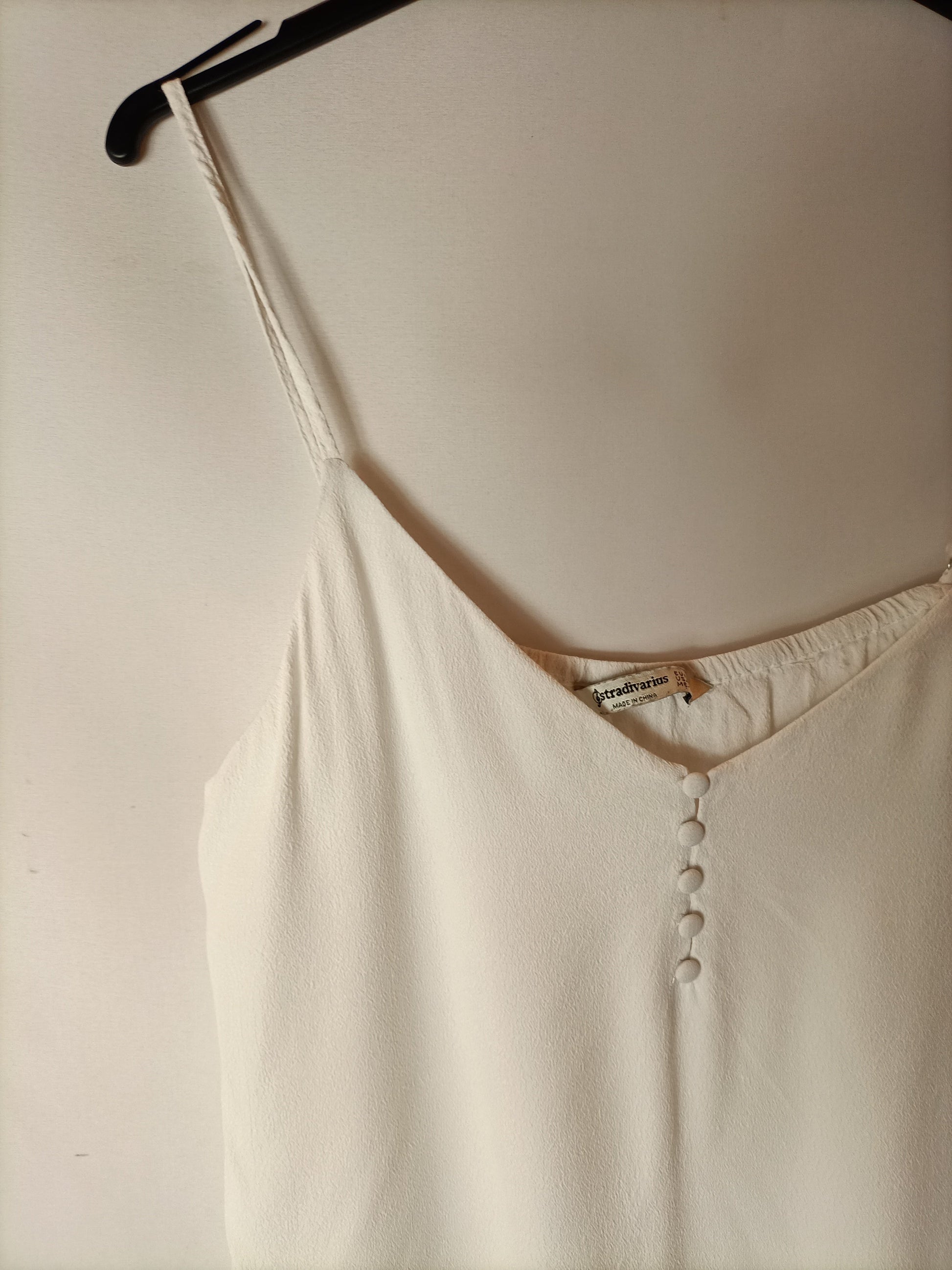 top blanco básico con detalle de botones en el escote. tirantes ajustables. no elástico.