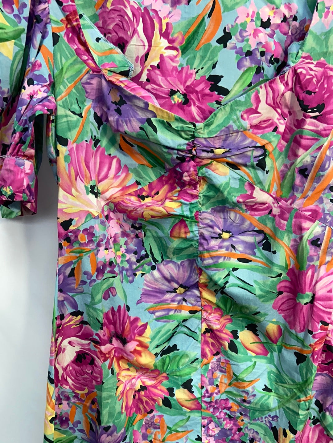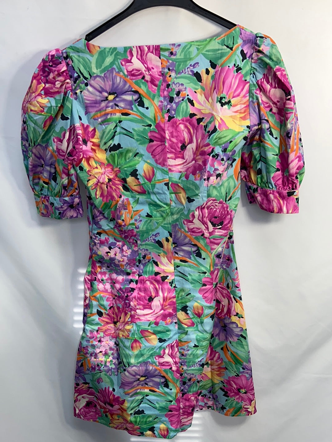 Vestido corto estampado multicolor con flores. Escote fruncido y mangas abullonadas. De sisa a sisa 44cm largo 84cm
