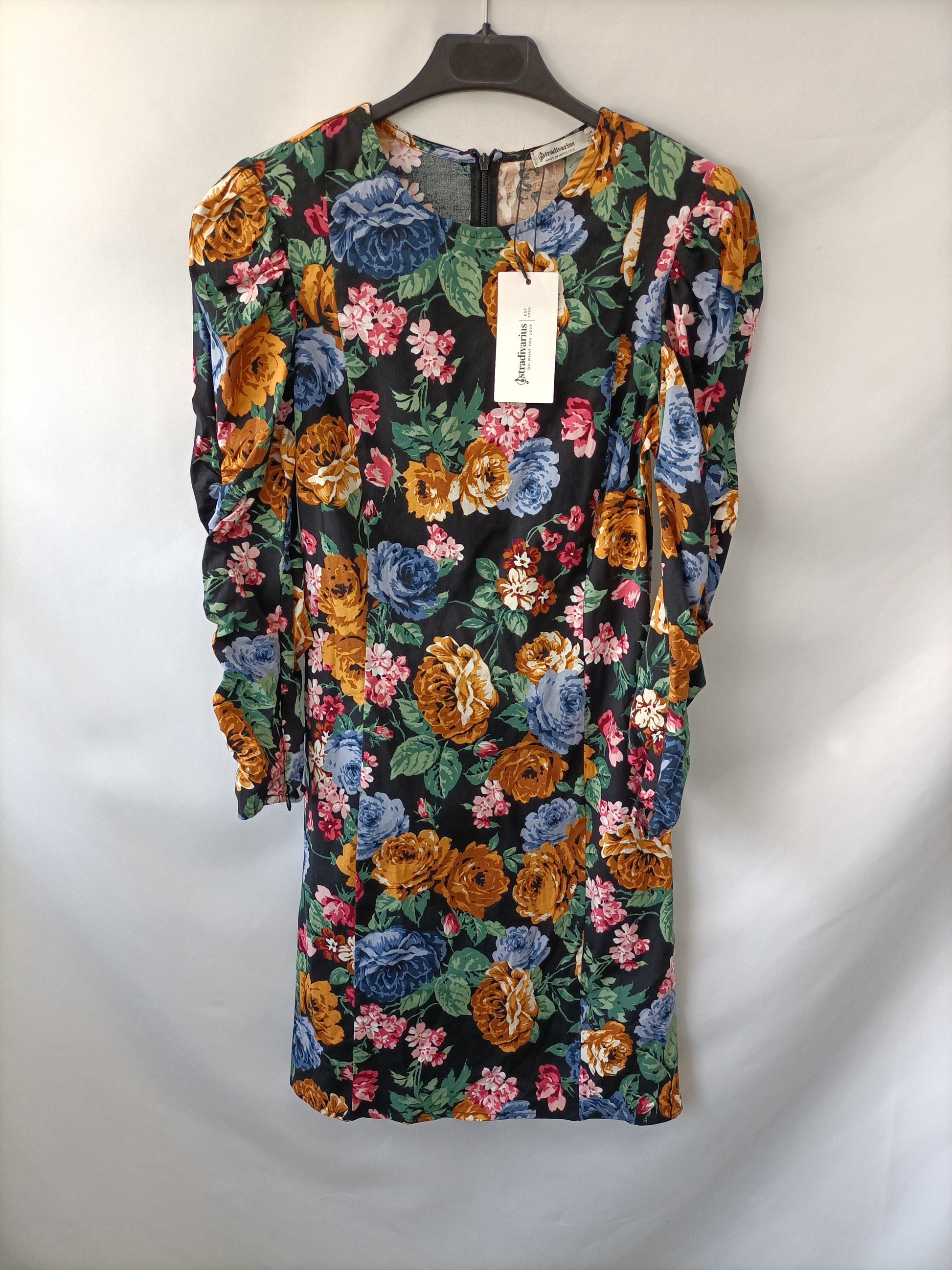 NUEVO CON ETIQUETA. Vestido negro con flores ajistados y con las mangas fruncidas y ligeramente abullonadas. No elástico. Se abrocha con cremallera trasera. De sisa a sisa 36 cm largo 86 cm
