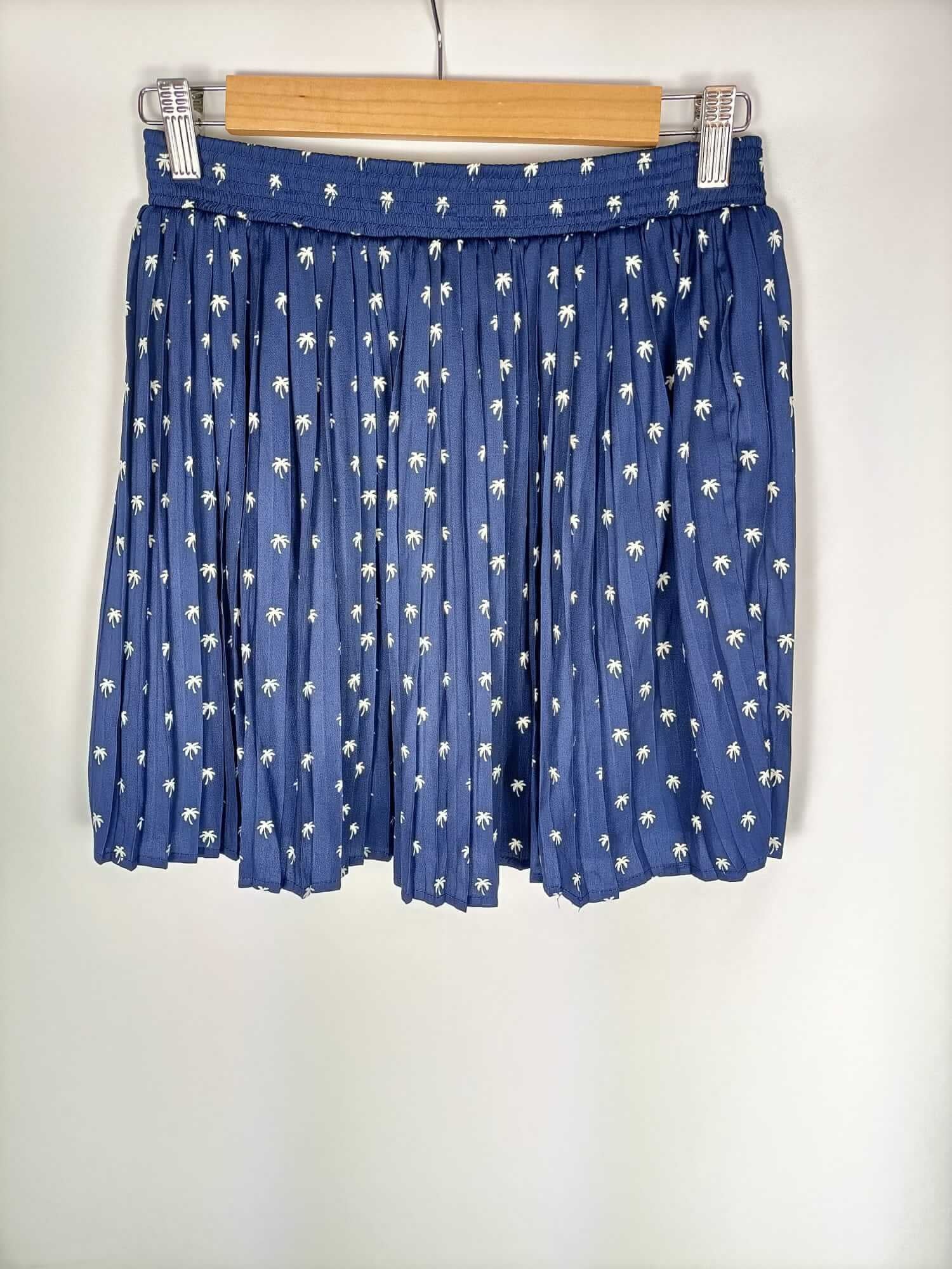 Stradivarius. Falda mini de tablas azul con estampado de palmeras. Cintura elástica. Fluida. Largo 44cm