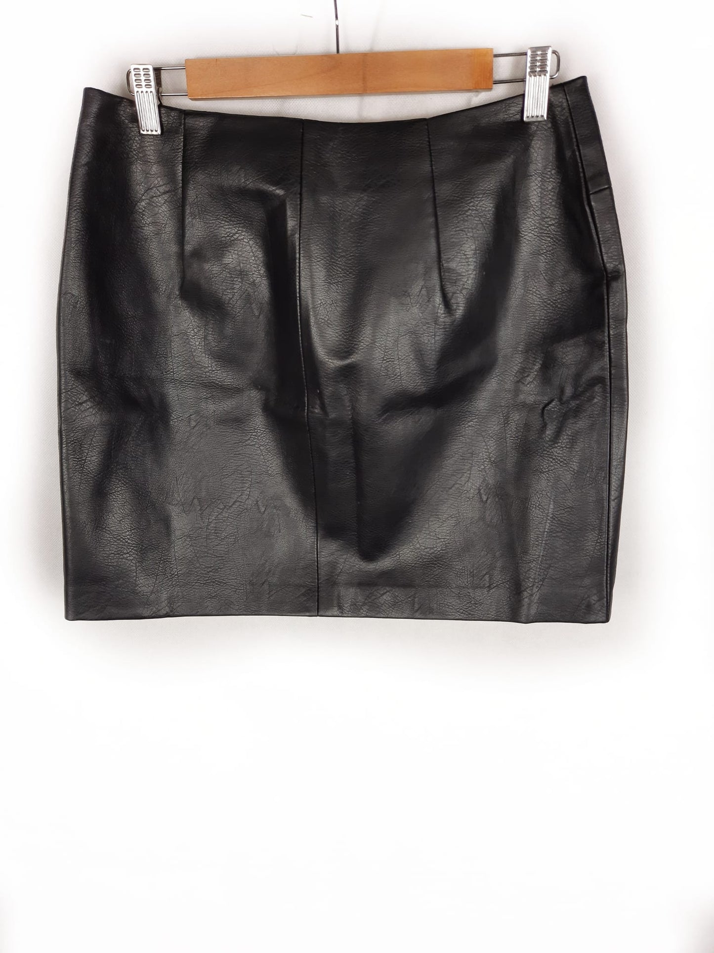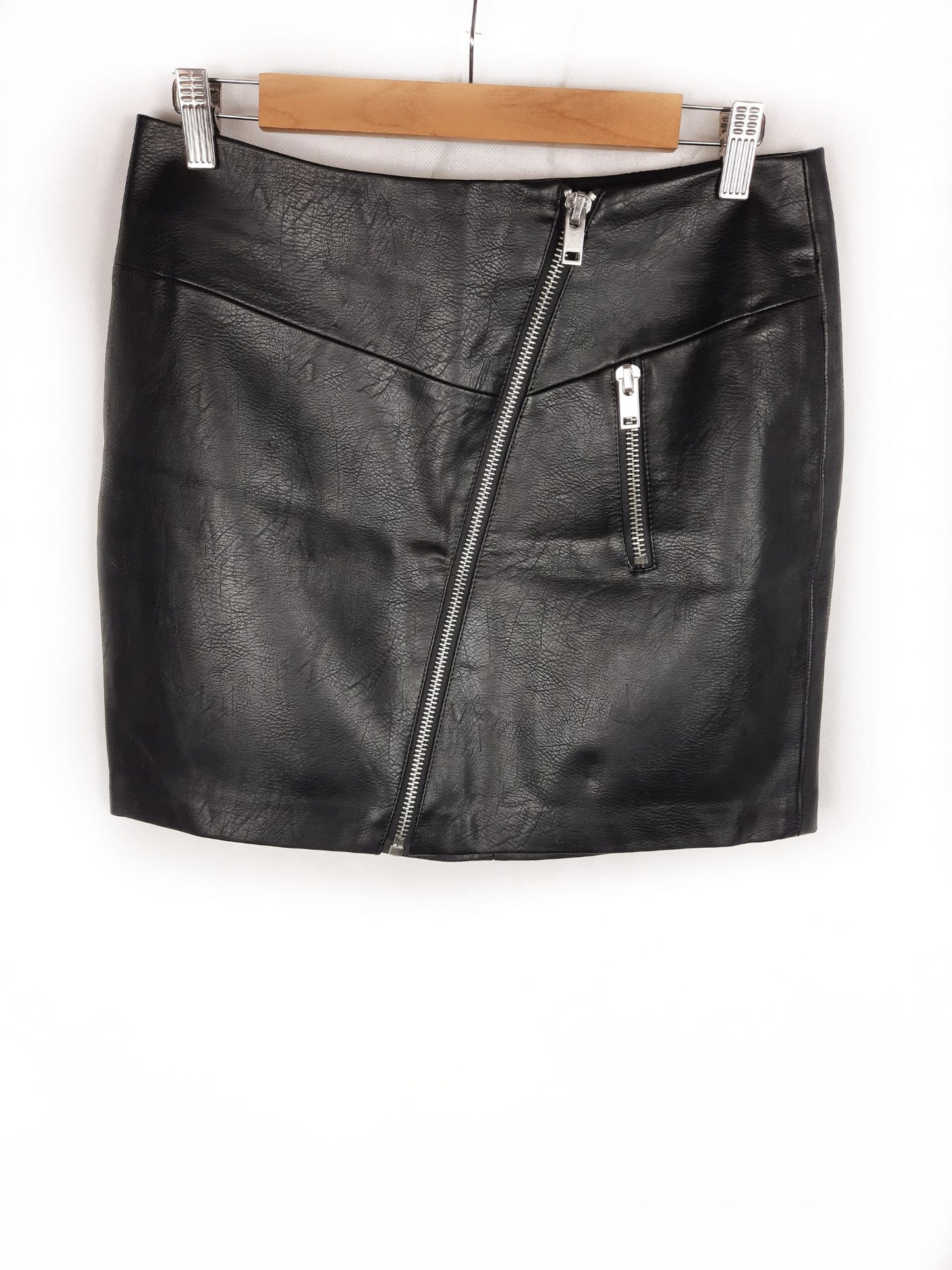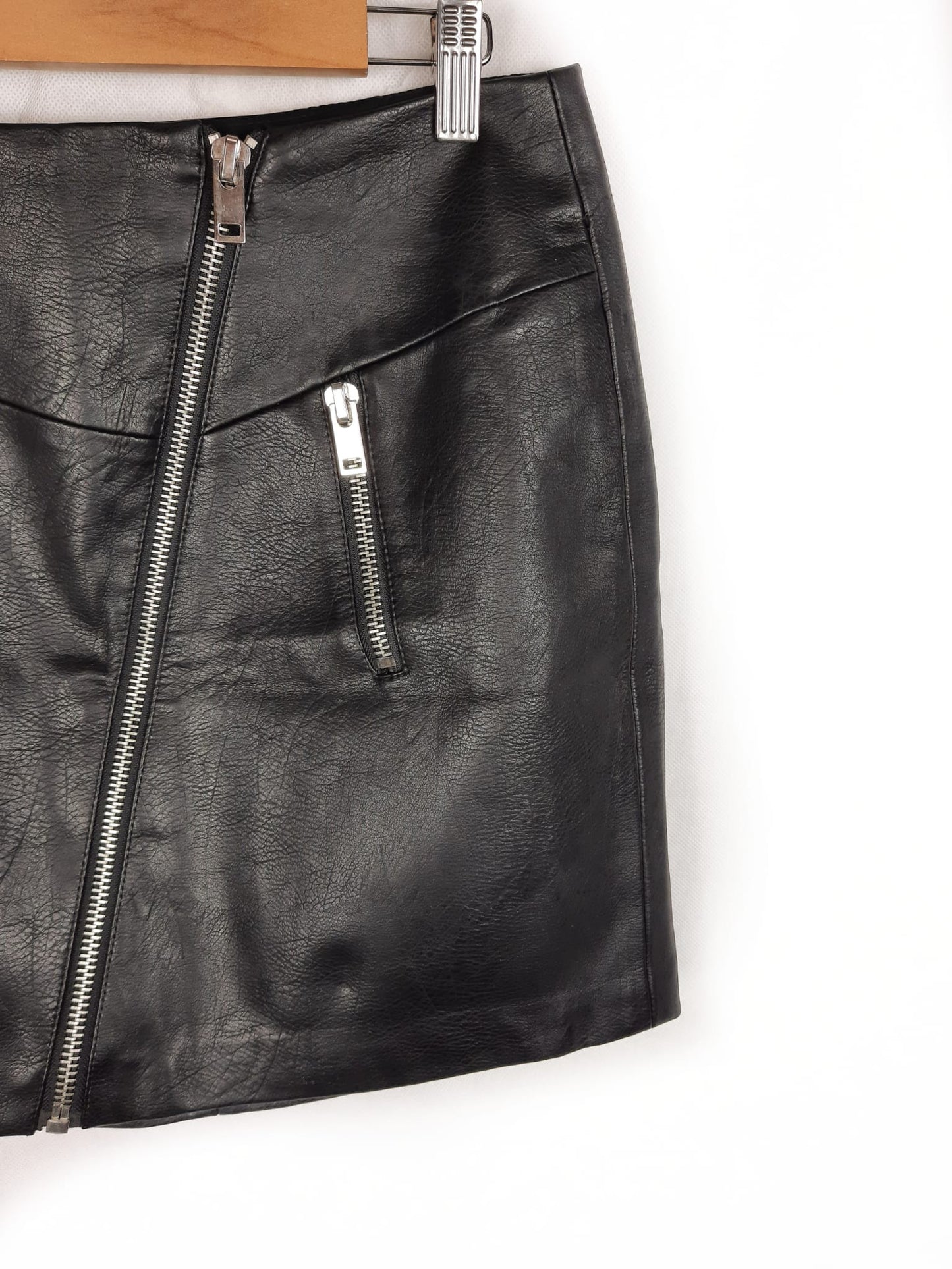Falda corta de polipiel negra con cremallera. No elástica. Cintura 46 cm largo 43 cm