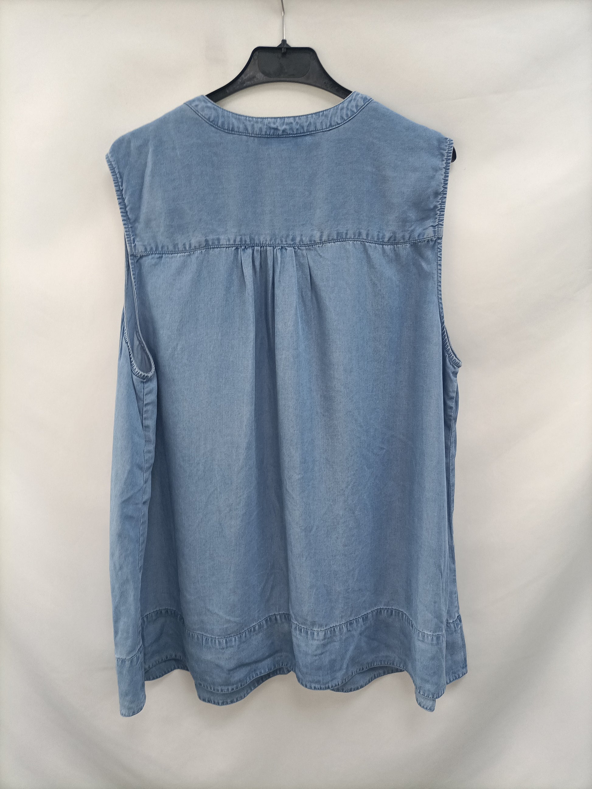 Camisa vaquera sin mangas con botones en la parte delantera y un pequeño volante abajo.