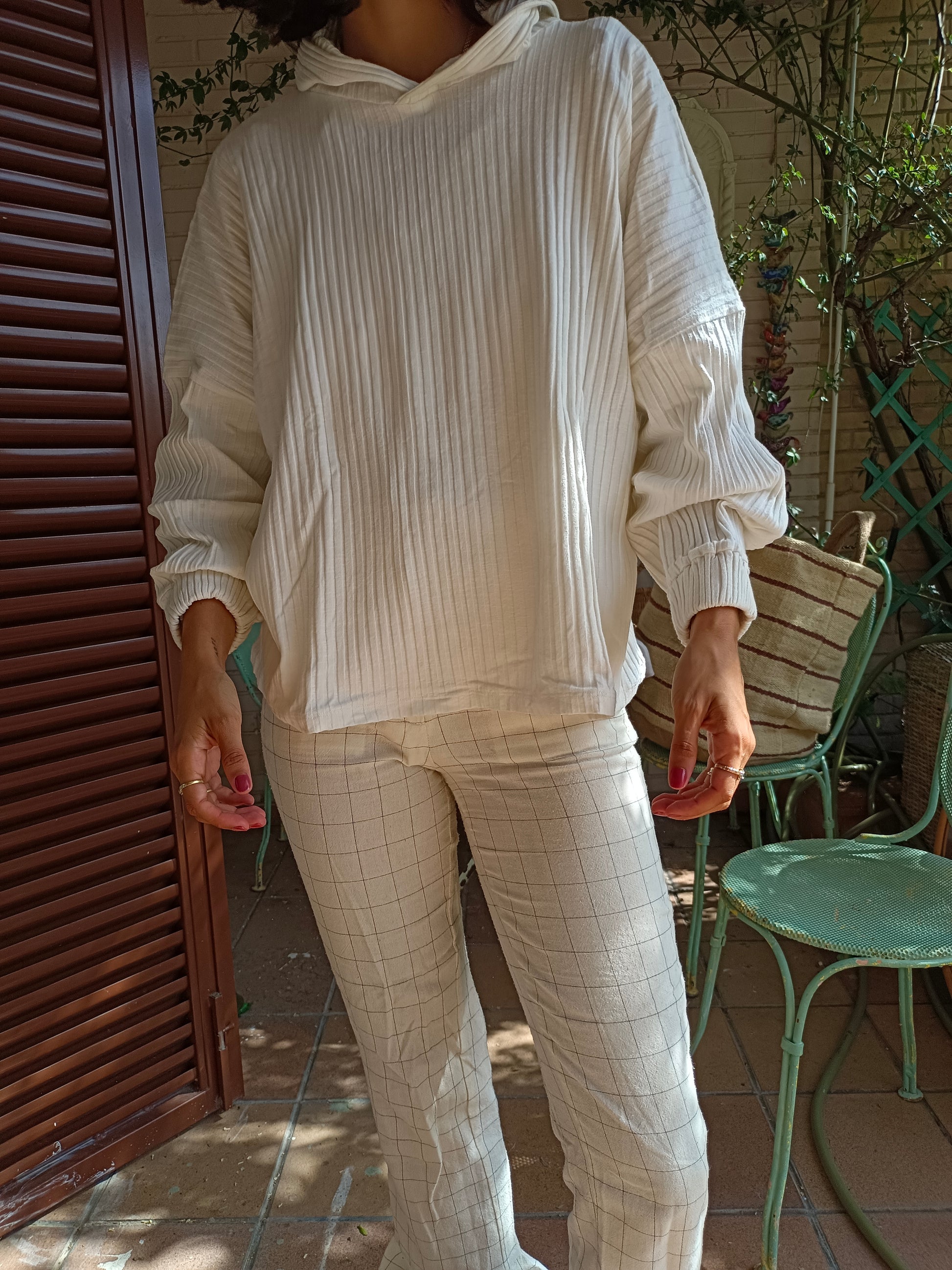 sudadera beige de canalé con capucha. ancha. elástica. tara:mini mancha
