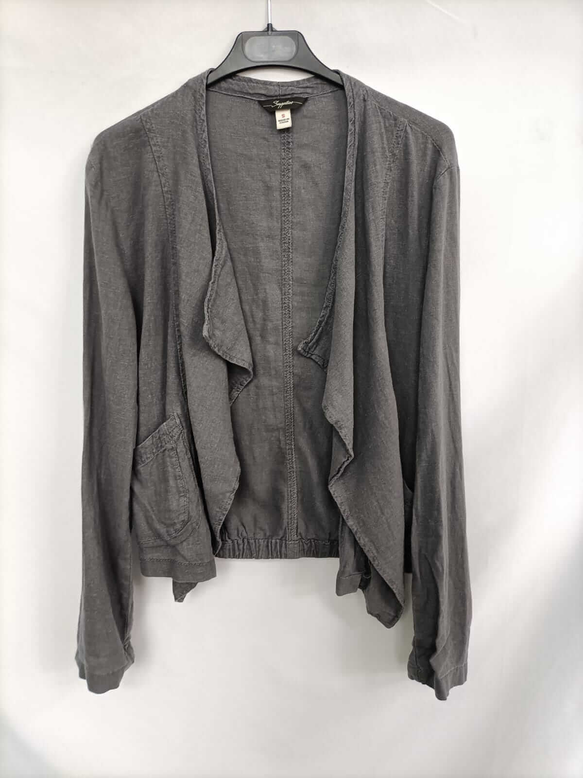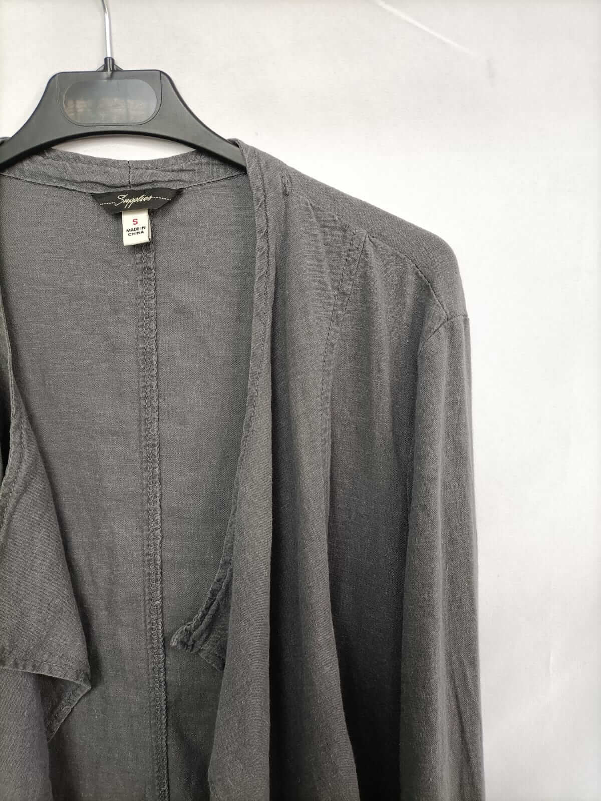 Supplies. Cazadora de lino finita y fluida gris jaspeado. No elástica. No se abrocha. De sisa a sisa 46 cm largo 59 cm