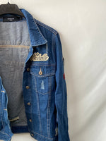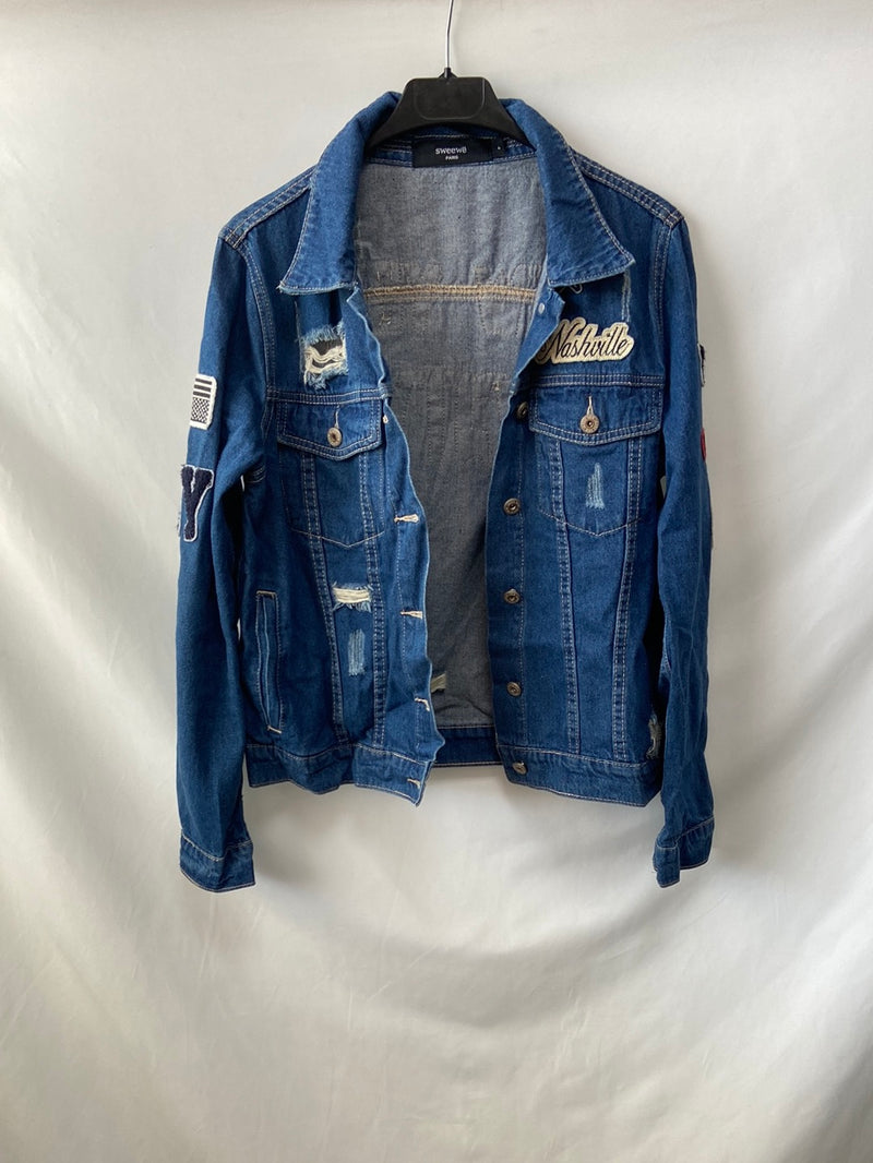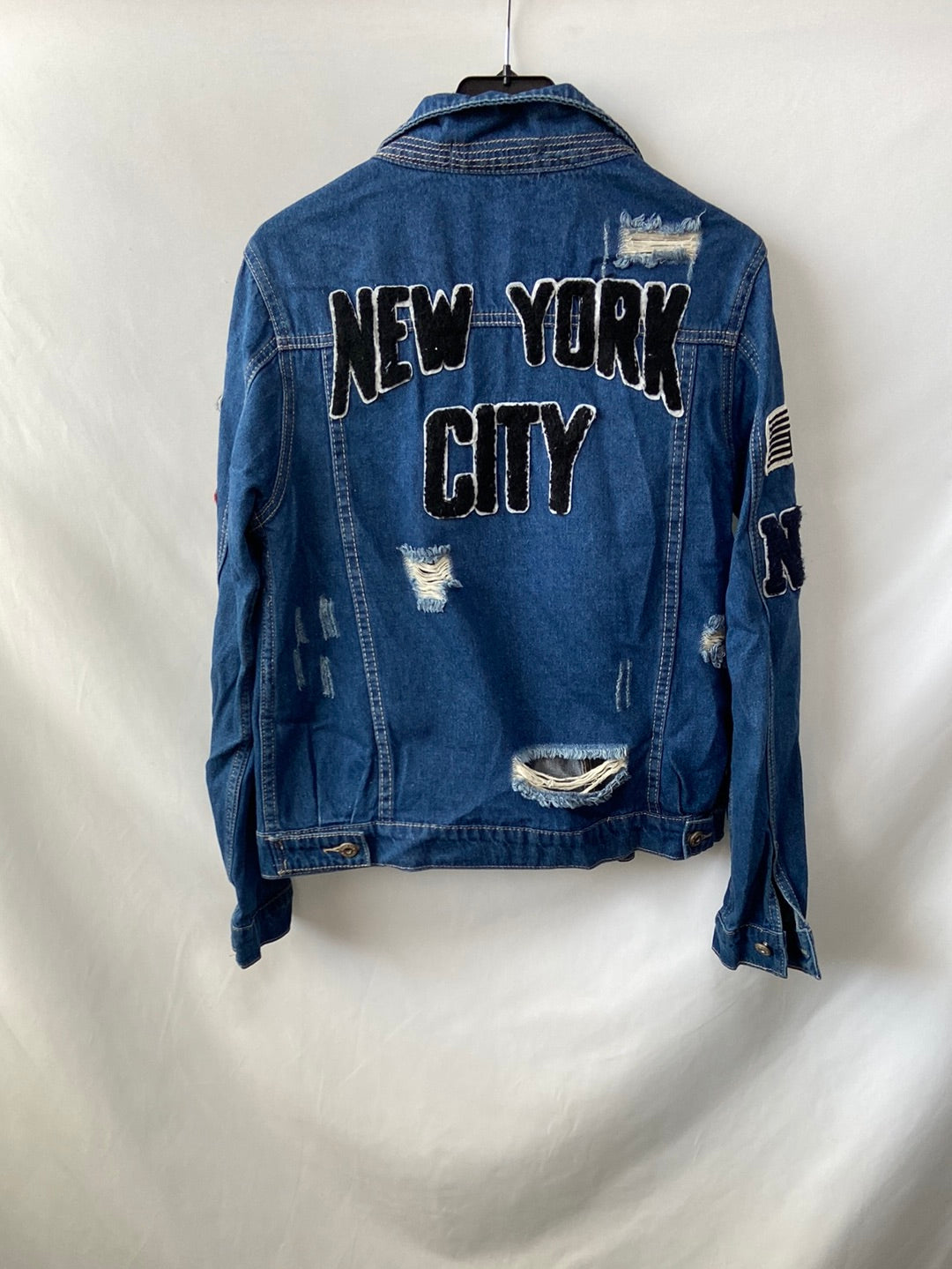 Cazadora vaquera con parches y rotos. No es elástica. De sisa a sisa 45 cm largo 57 cm
