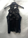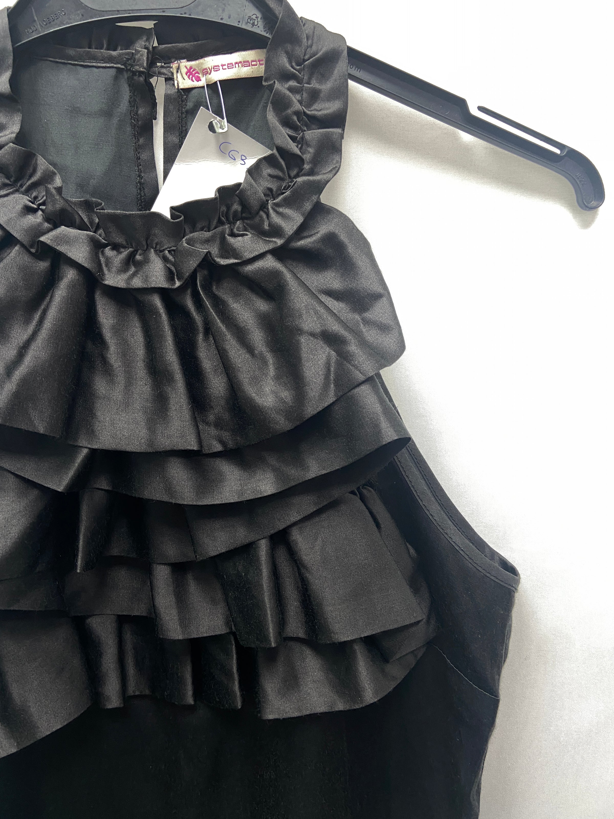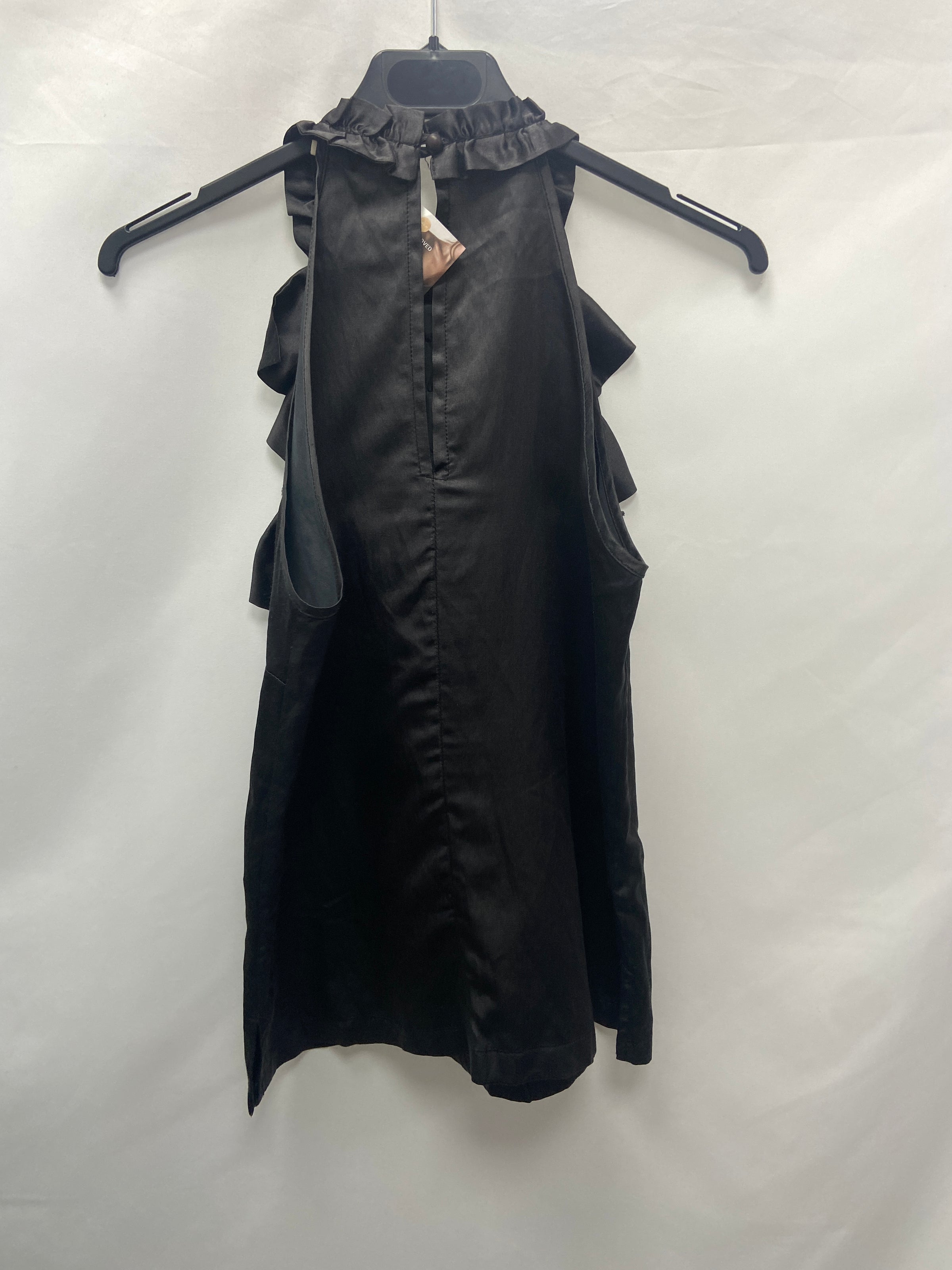 Top negro de raso con el cuello halter y volante en la parte delantera