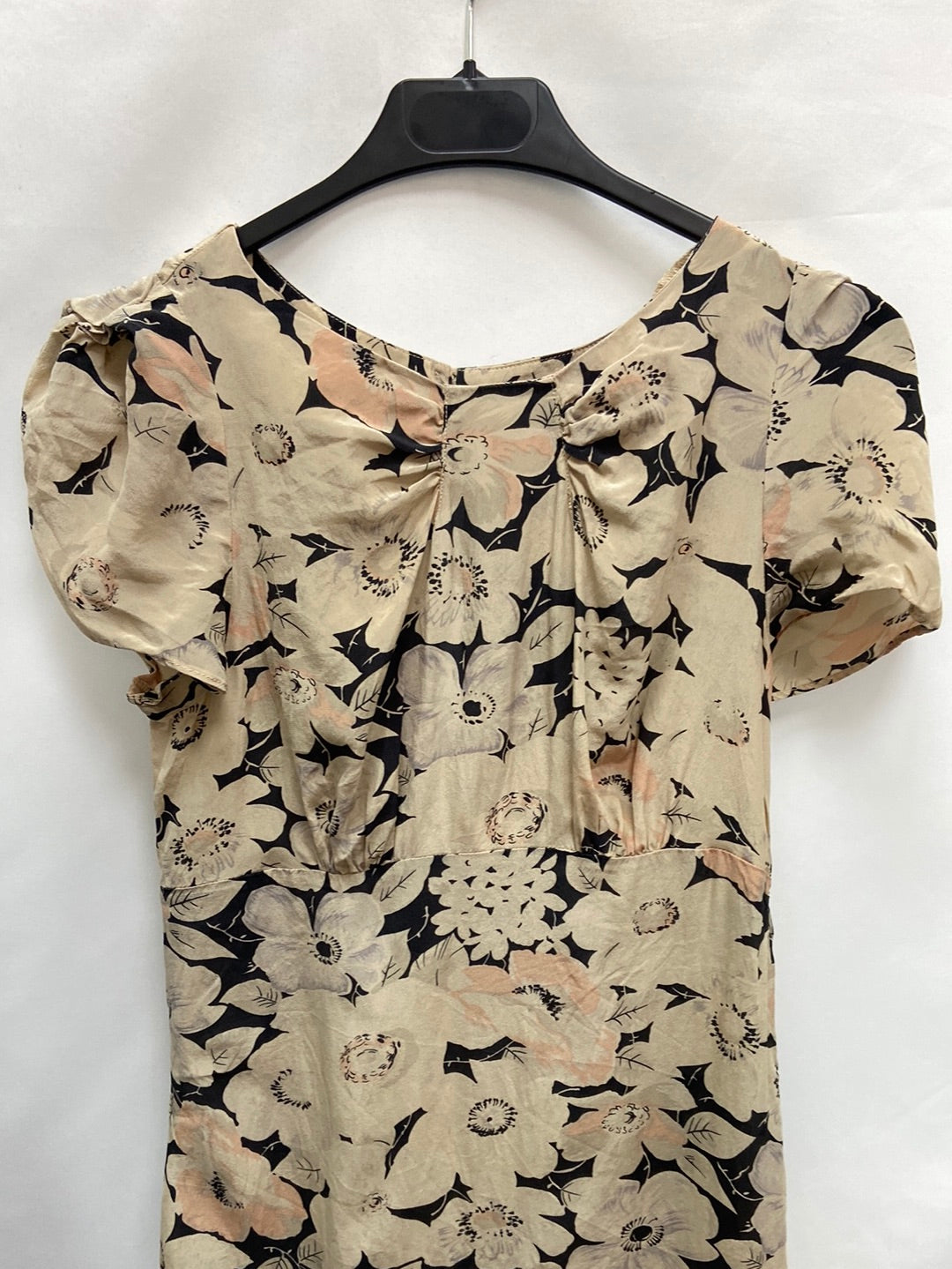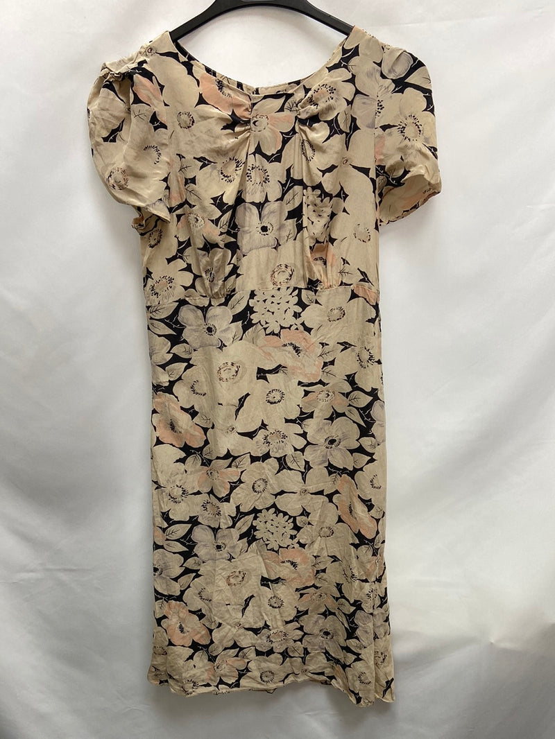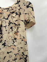 Vestido de seda beige con flores en negro, rosa y blanco muy fluidos y con unos pliegues en el escote