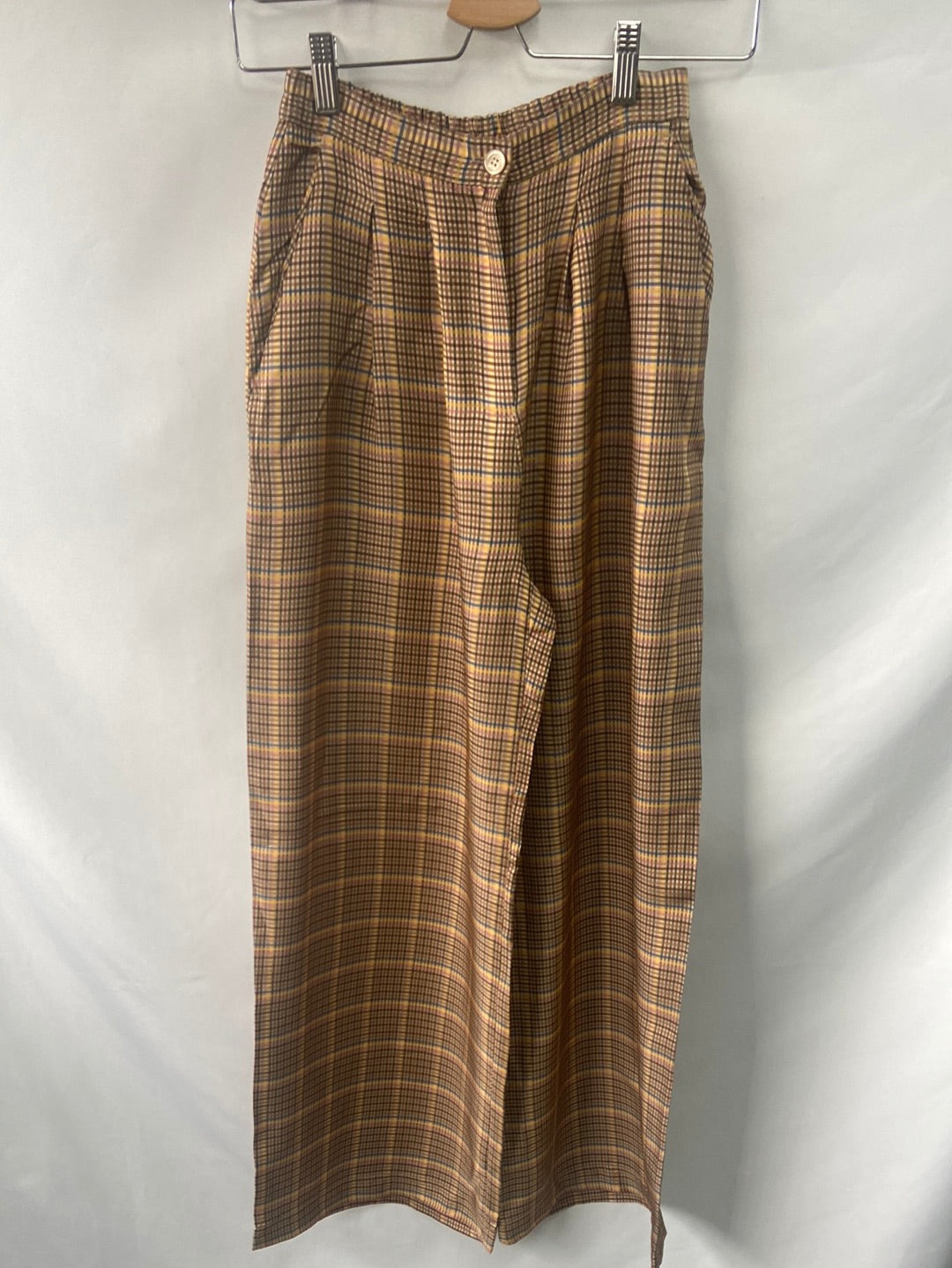 pantalones cuadros tonos tierra anchos fluidos estilo de vestir. Cintura elástica por detrás de 34/36 cm y largo de 111 cm .