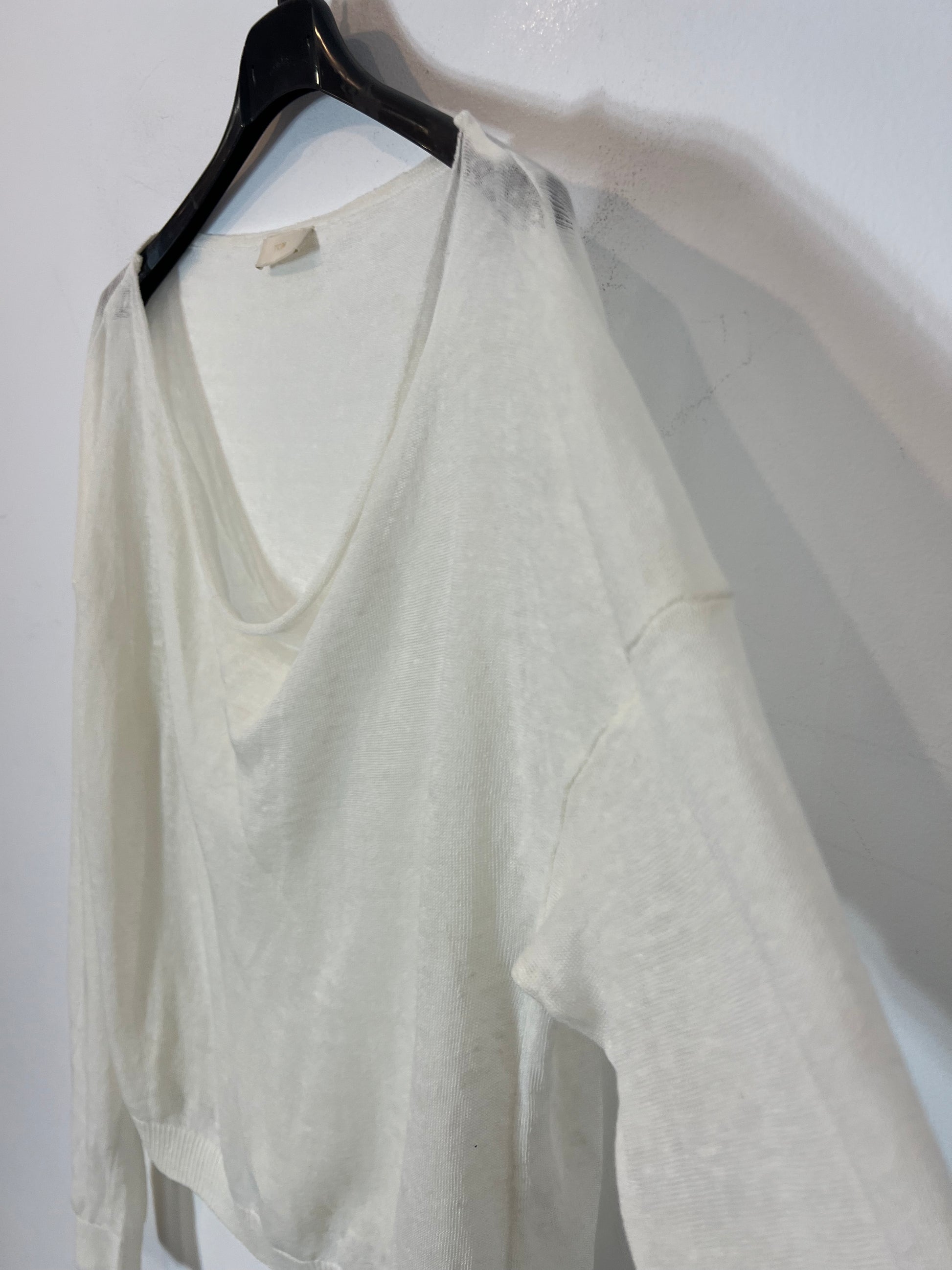 top blanco fino semitransparente con un 87% lino. largo cm. Tara: tiene algún enganchón . Largo 58cm