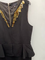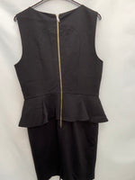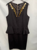 Vestido negro con volante en la cintura es ajustado y tiene detalles de pedrería en el escote