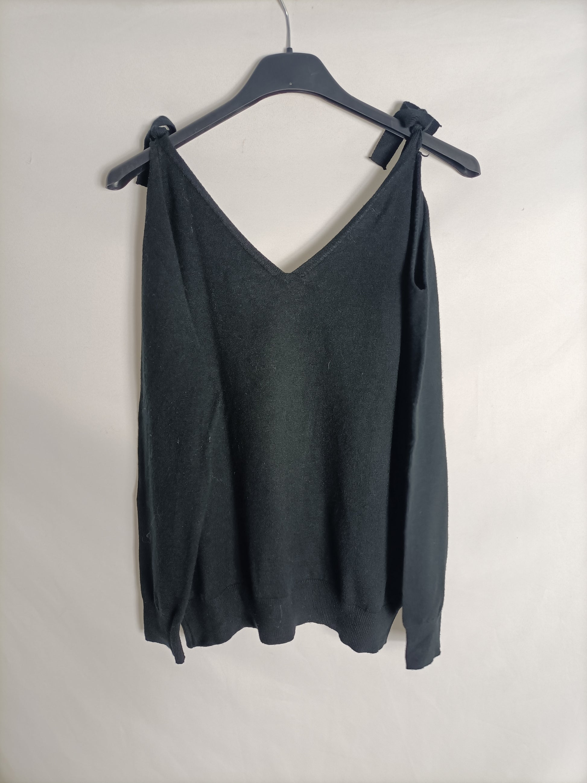 jersey negro con los hombros al aire. destalle de pedrería en el cuello.