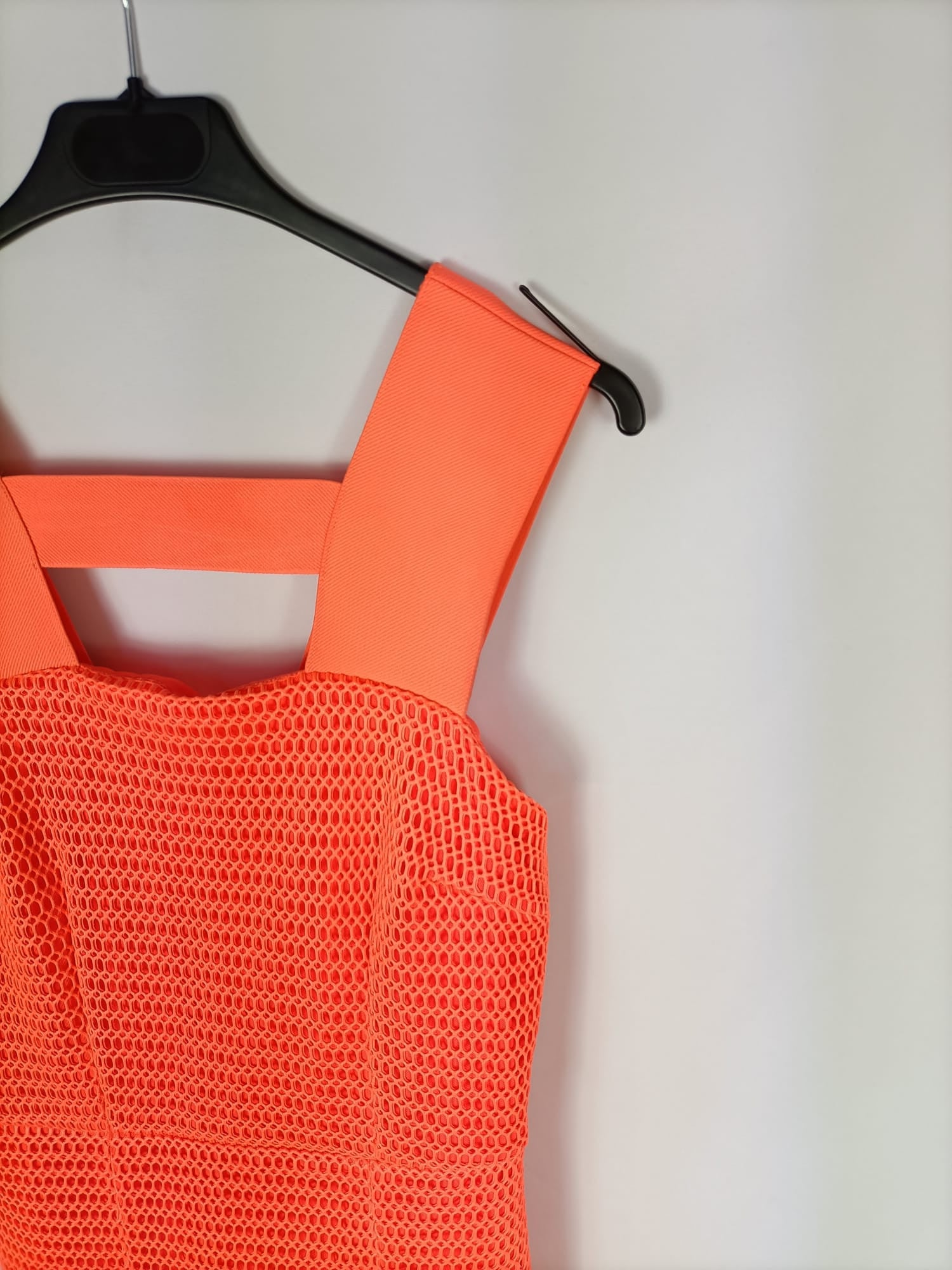 Vestido de rejilla con tirantes elásticos y flecos en la parte de abajo. Forro interior. Elástico. De sisa a sisa 40 cm, largo 138 cm