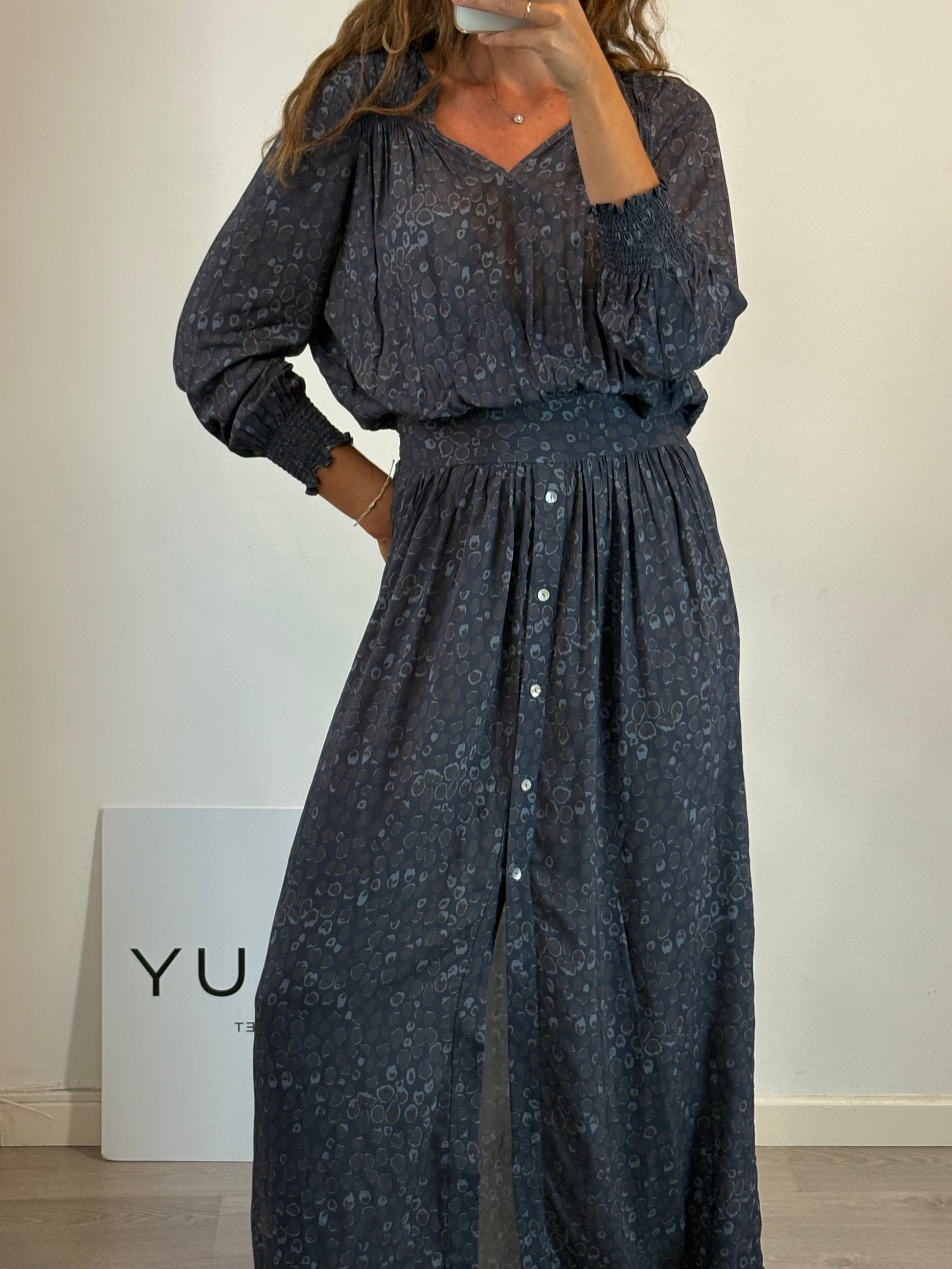 NUEVO CON ETIQUETA. vestido largo gris estampado. cintura semielástica y abotonado. de sisa a sisa 57 cm largo 160cm