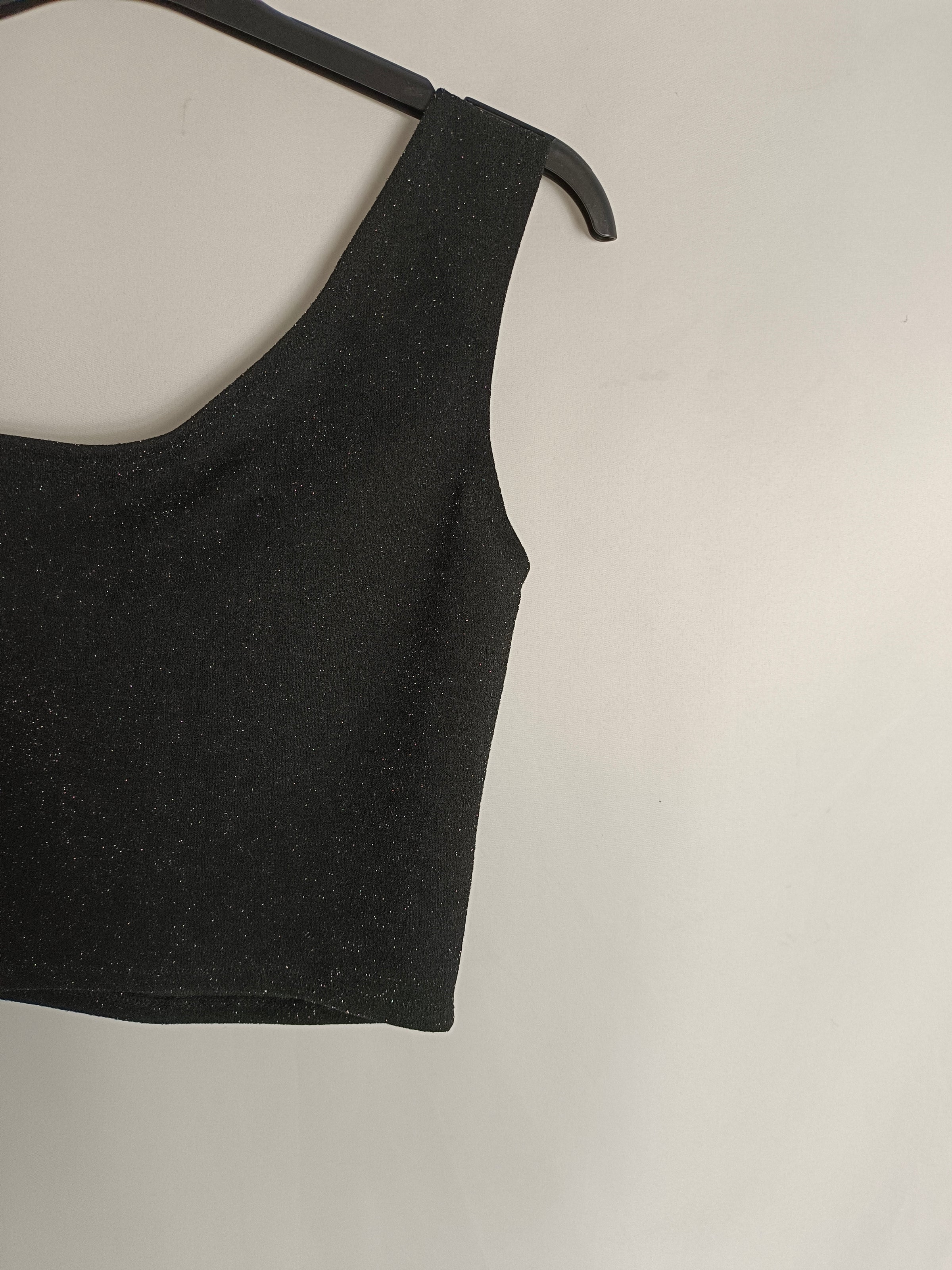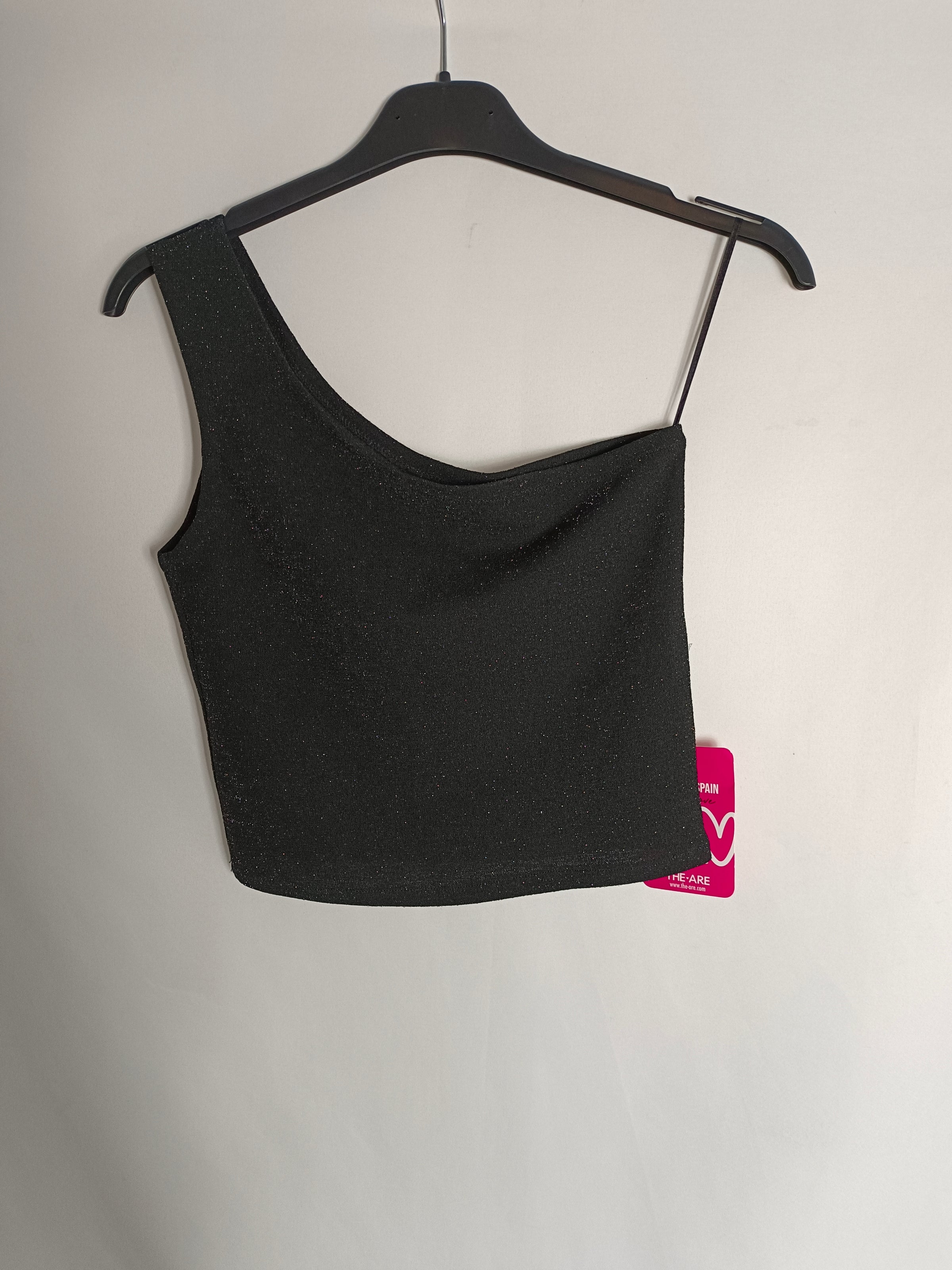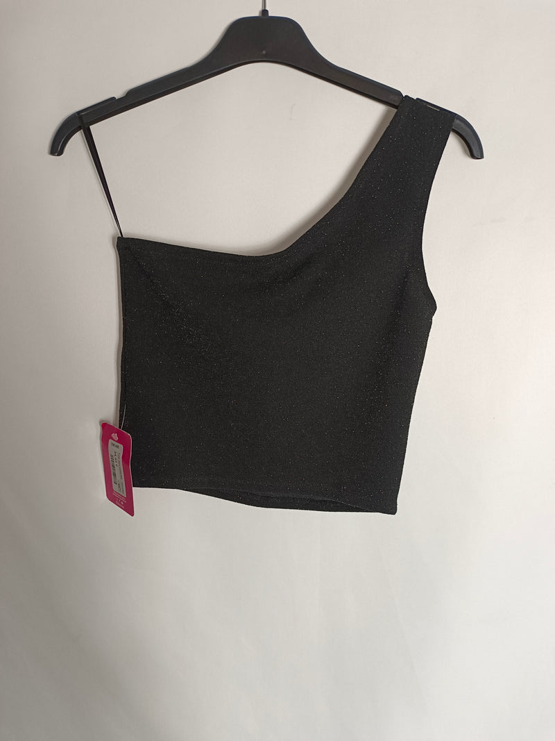 NUEVO CON ETIQUETA. Top negro asimétrico elástico con detalle de hilos metálicos.