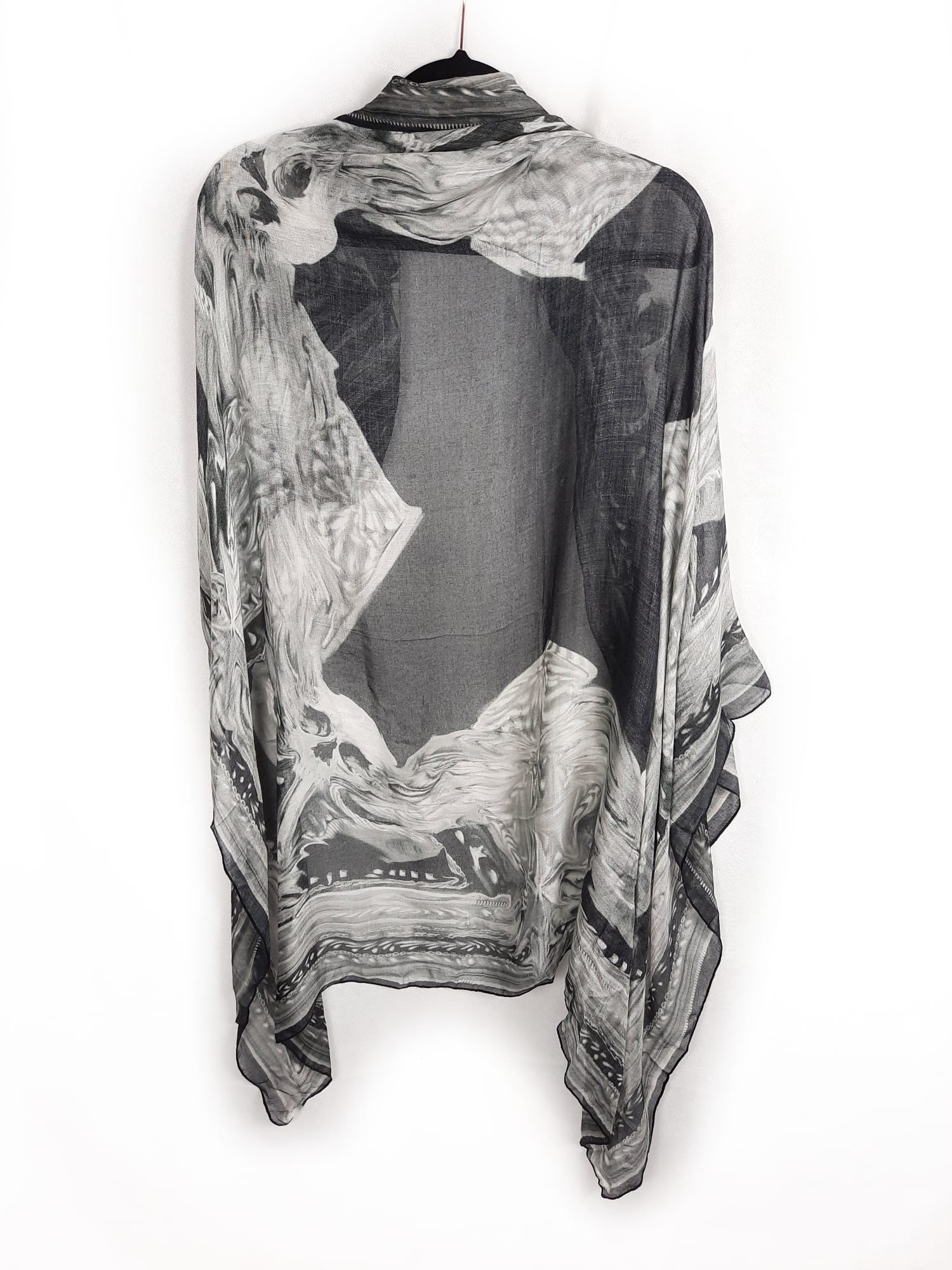 NUEVO CON ETIQUETA. Fular gris fluido con estampado abstracto.