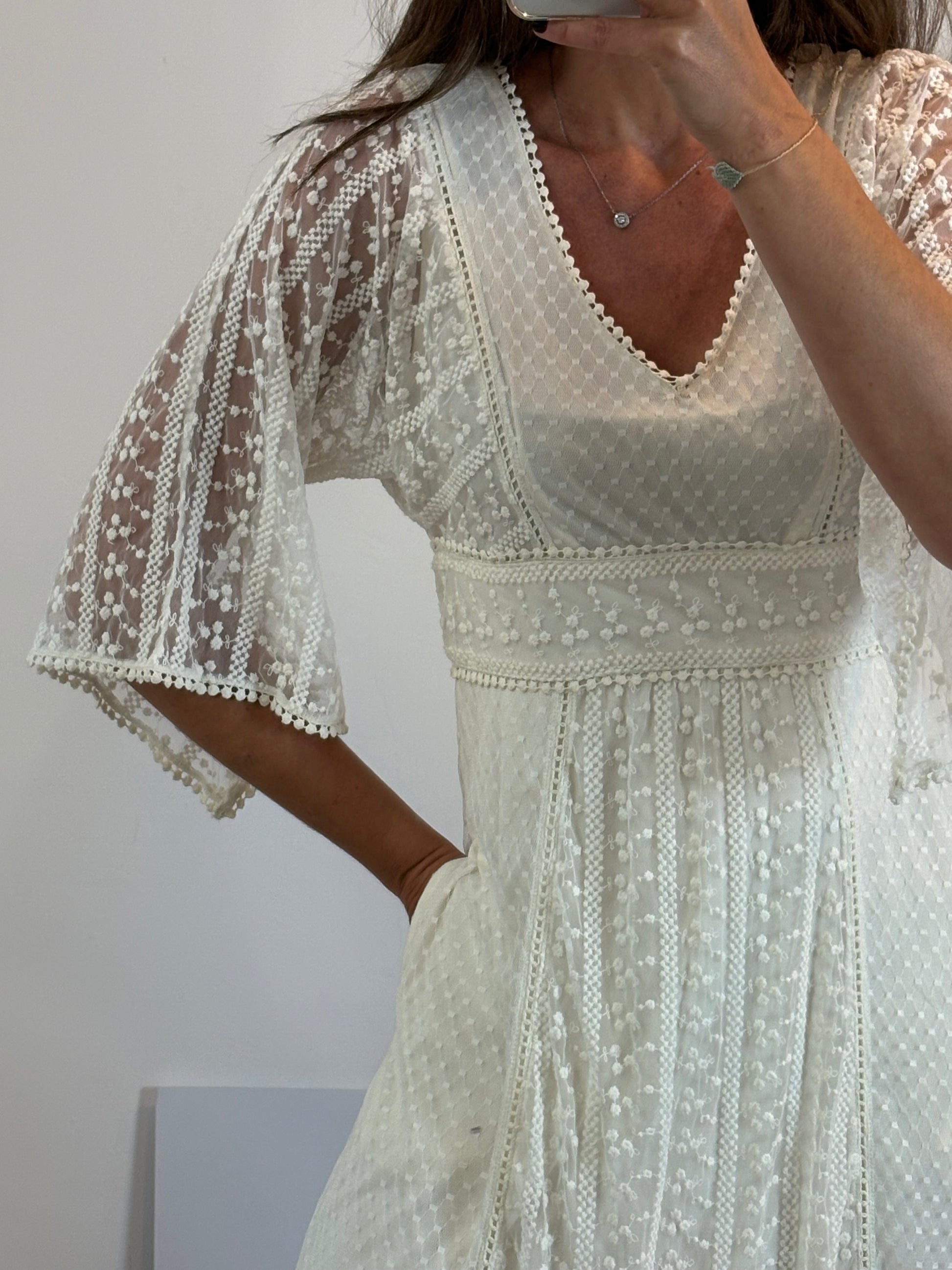 Vestido largo blanco roto de encaja con. Mangas semitransparentes. Semi elástico. Largo 150 cm, cintura 42cm, de sisa a sisa 46cm.talla 42 en etiqueta