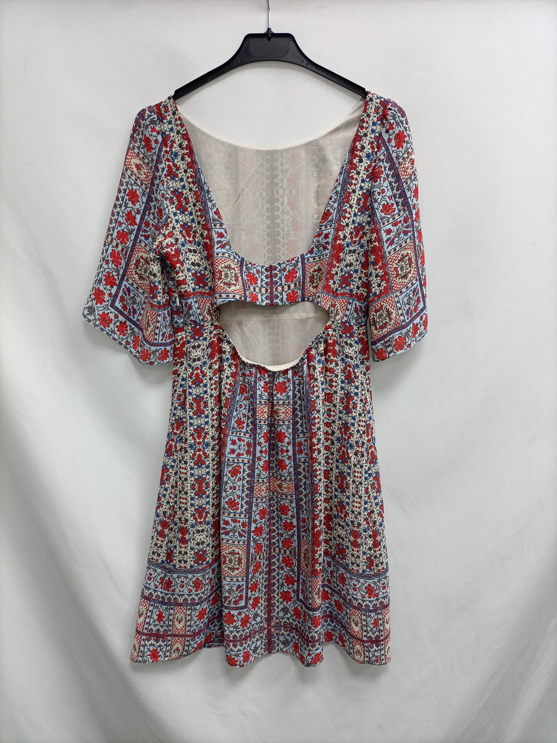 Vestido corto beige con flores azules y rojas. Espalda abierta con flores.