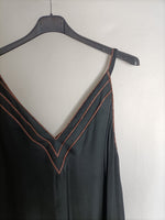 Vestido largo negro negro fluido de tirantes con detalle en el escote de hilos metálicos rosas.