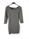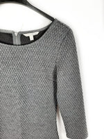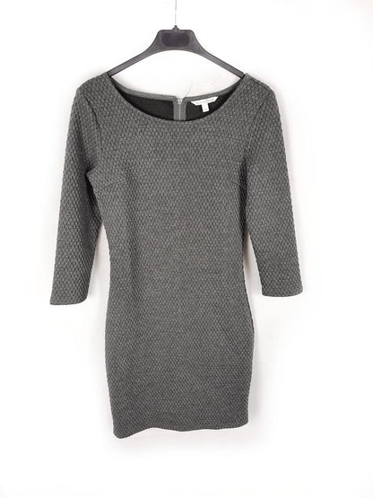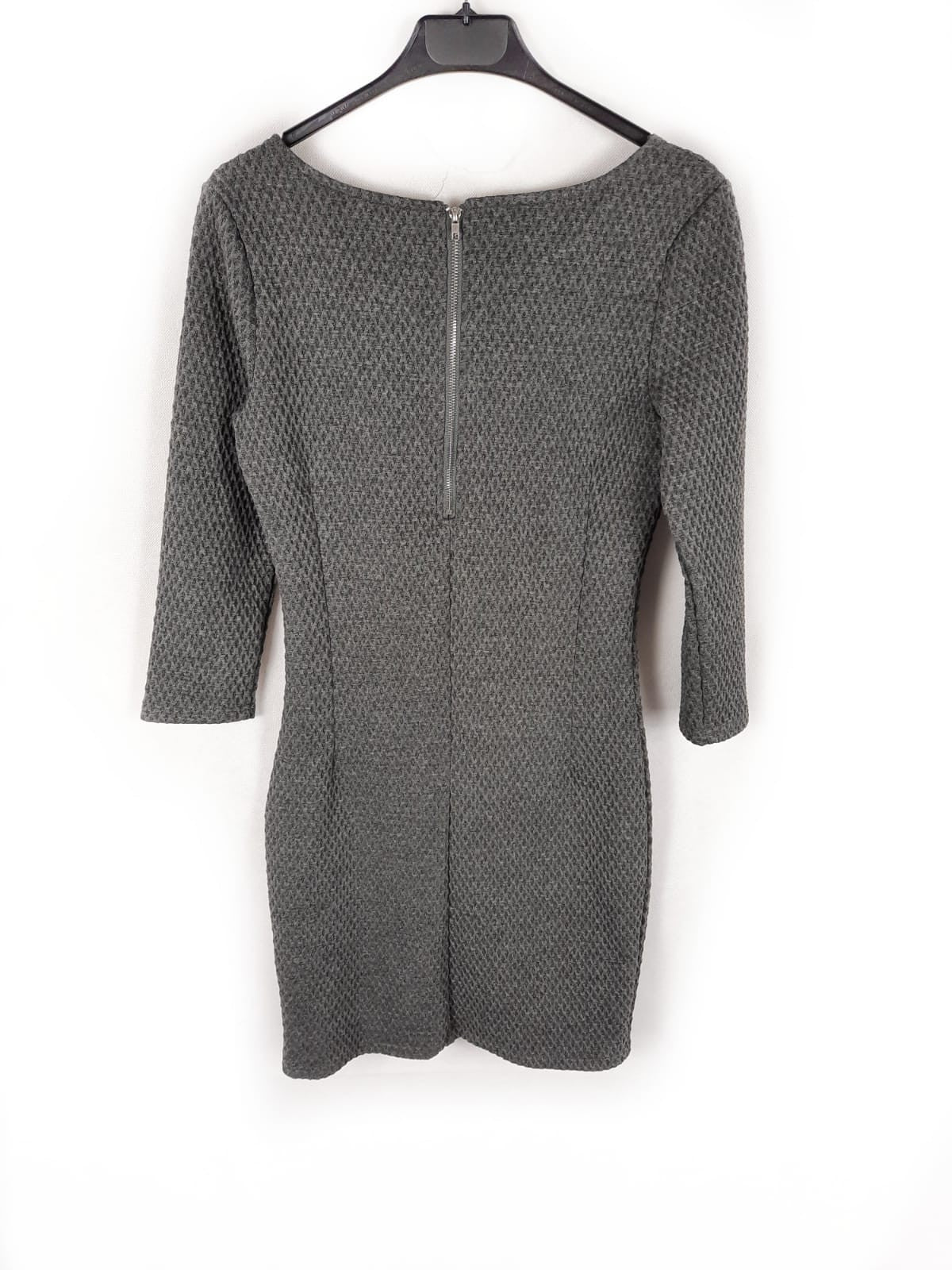 Vestido gris con textura ajustado y semielastico. Se abrocha con cremallera. De sisa a sisa 44 cm largo 85 cm