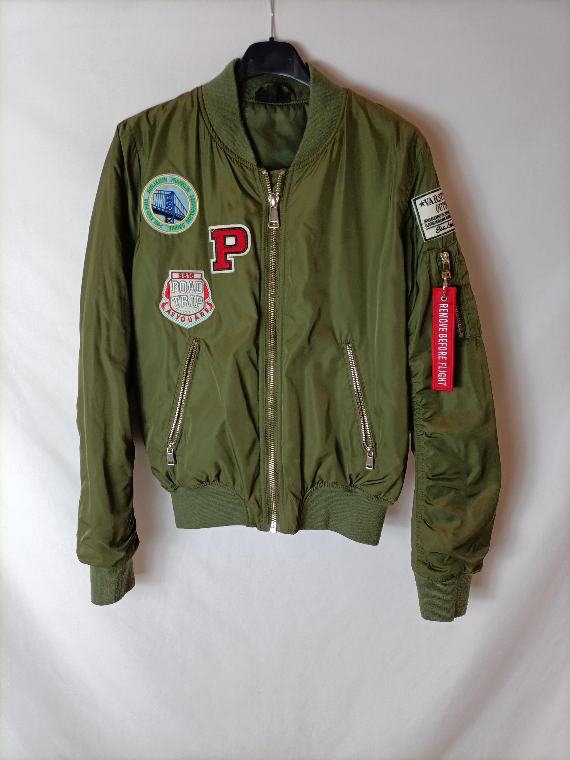 TOPSHOP. Bomber verde parches T.38