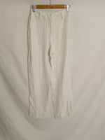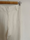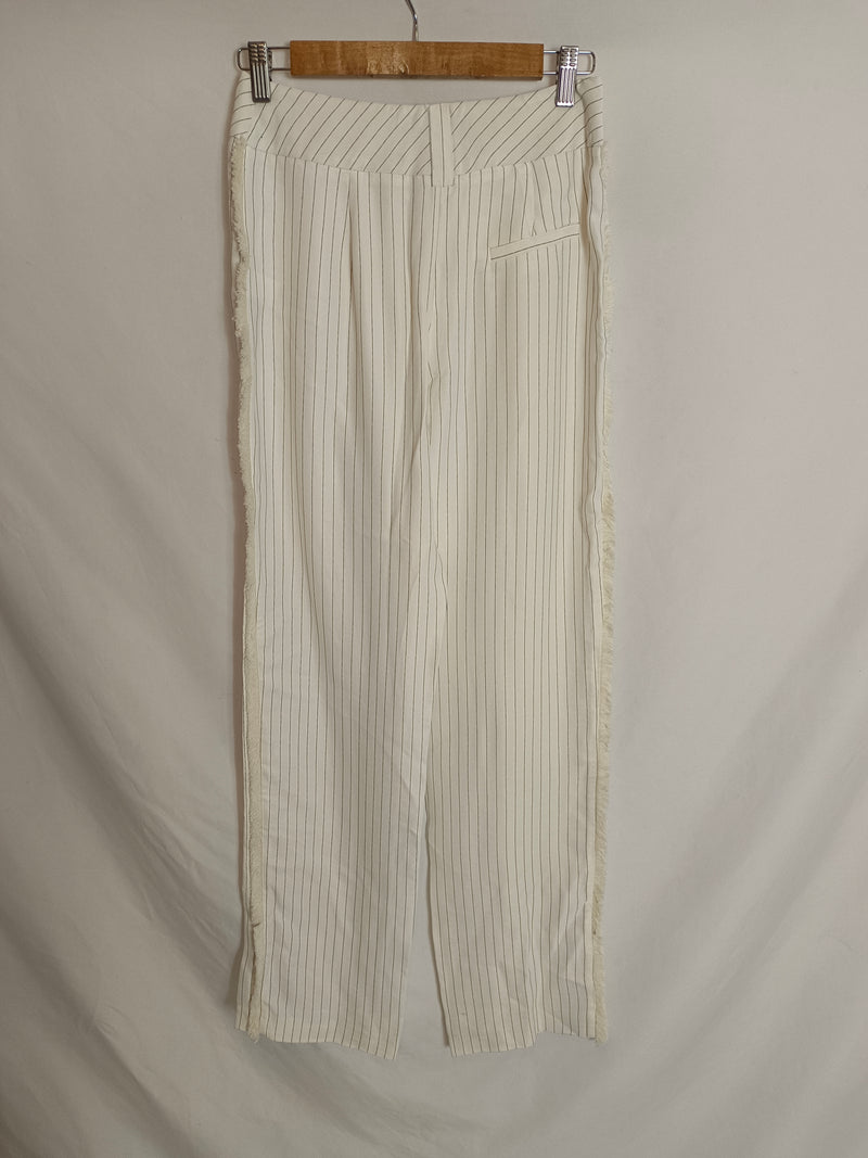Pantalón blanco recto fluido con rayas y detalle de flecos en el lateral.