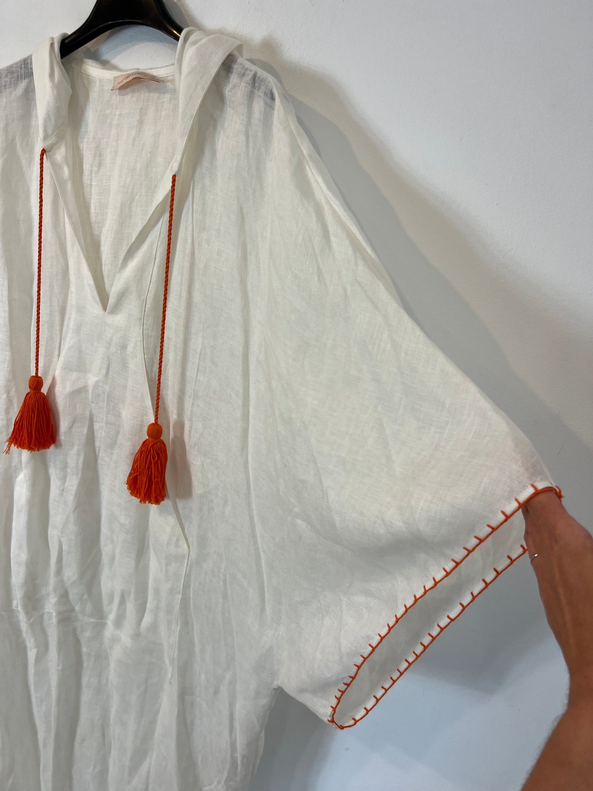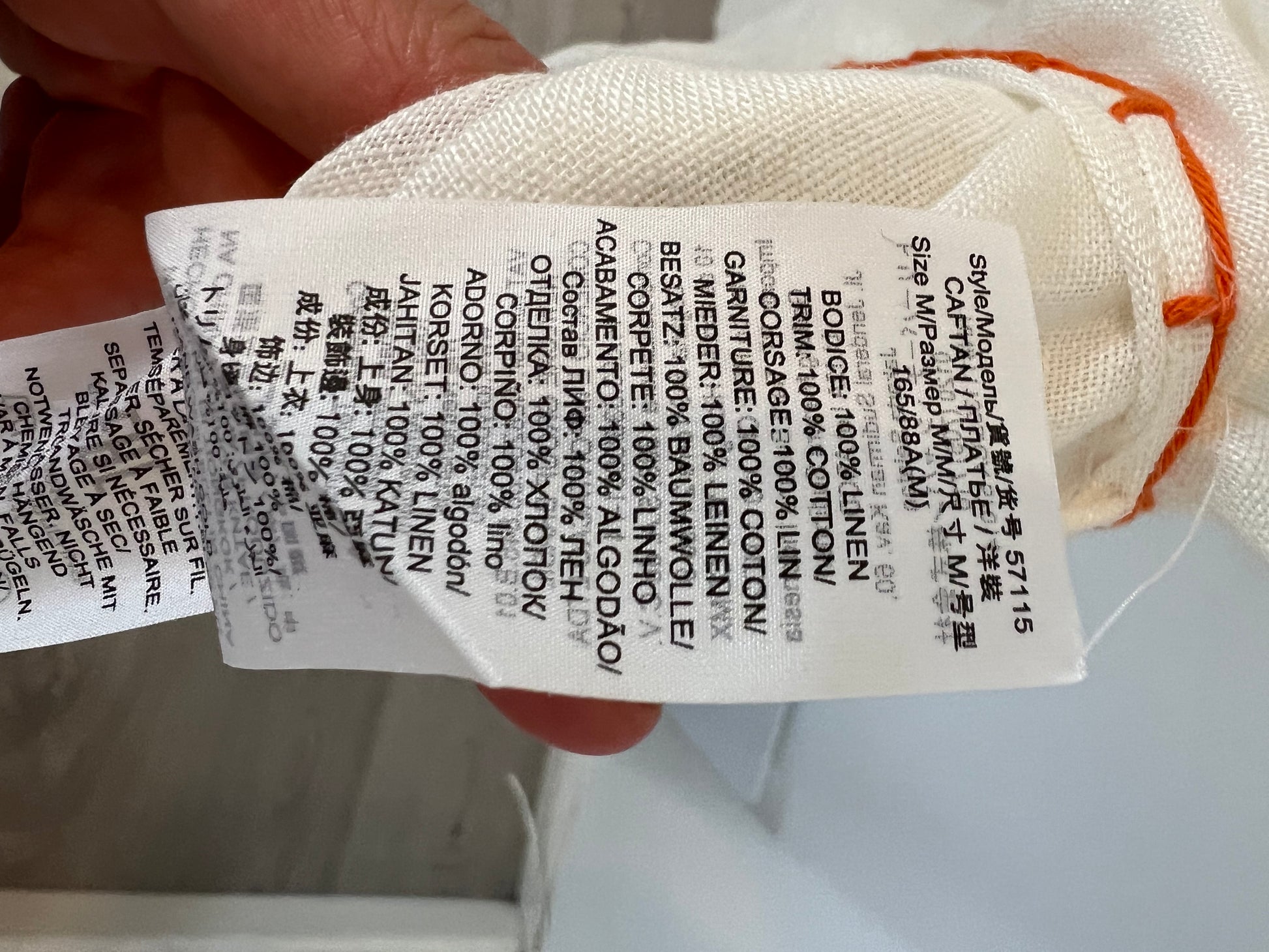 vestido largo de lino con detalle naranjas. largo 150 cm