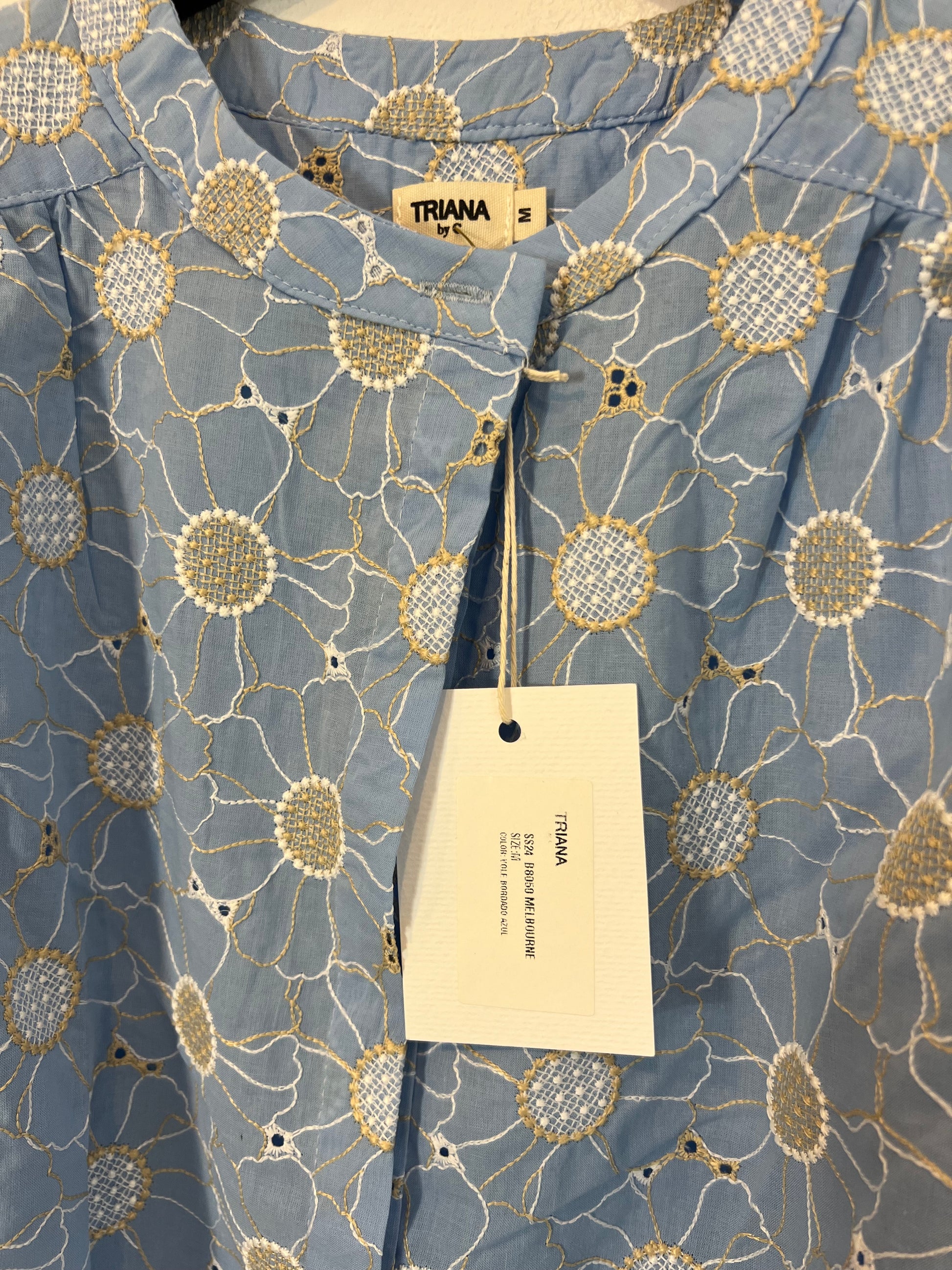 NUEVO CON ETIQUETA. Blusa azul con flores bordadas. De sisa a sisa 53cm, largo 61 cm espalda