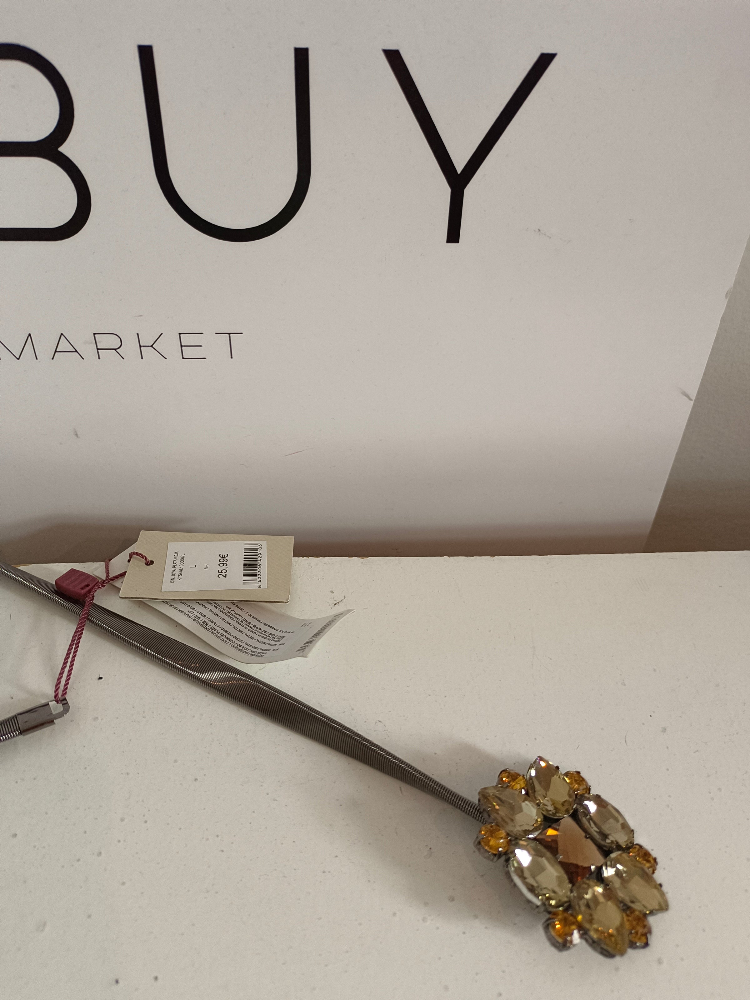 NUEVO CON ETIQUETA. Cinturón fino plateado elástico con hebilla de pedrería.