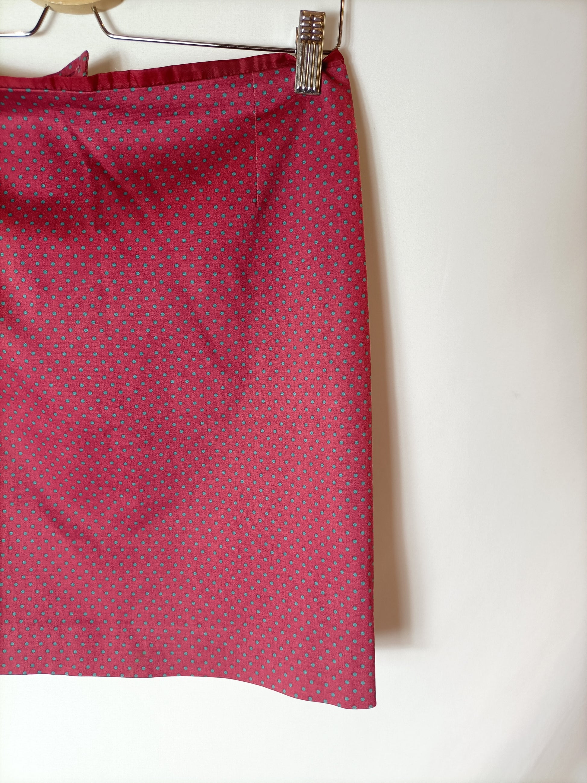 Falda corta burdeos estampada lunares verdes. Tejido no elástico. Cremallera trasera