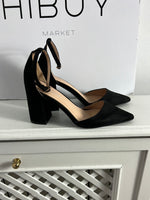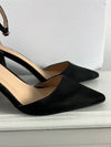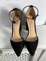 Zapatos tacón negro hebilla al tobillo y terminación en pico. Tara: tiene alguna marca pero poco perceptible