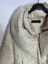 Abrigo beige estilo plumas cortito con detalles de lentejuelas