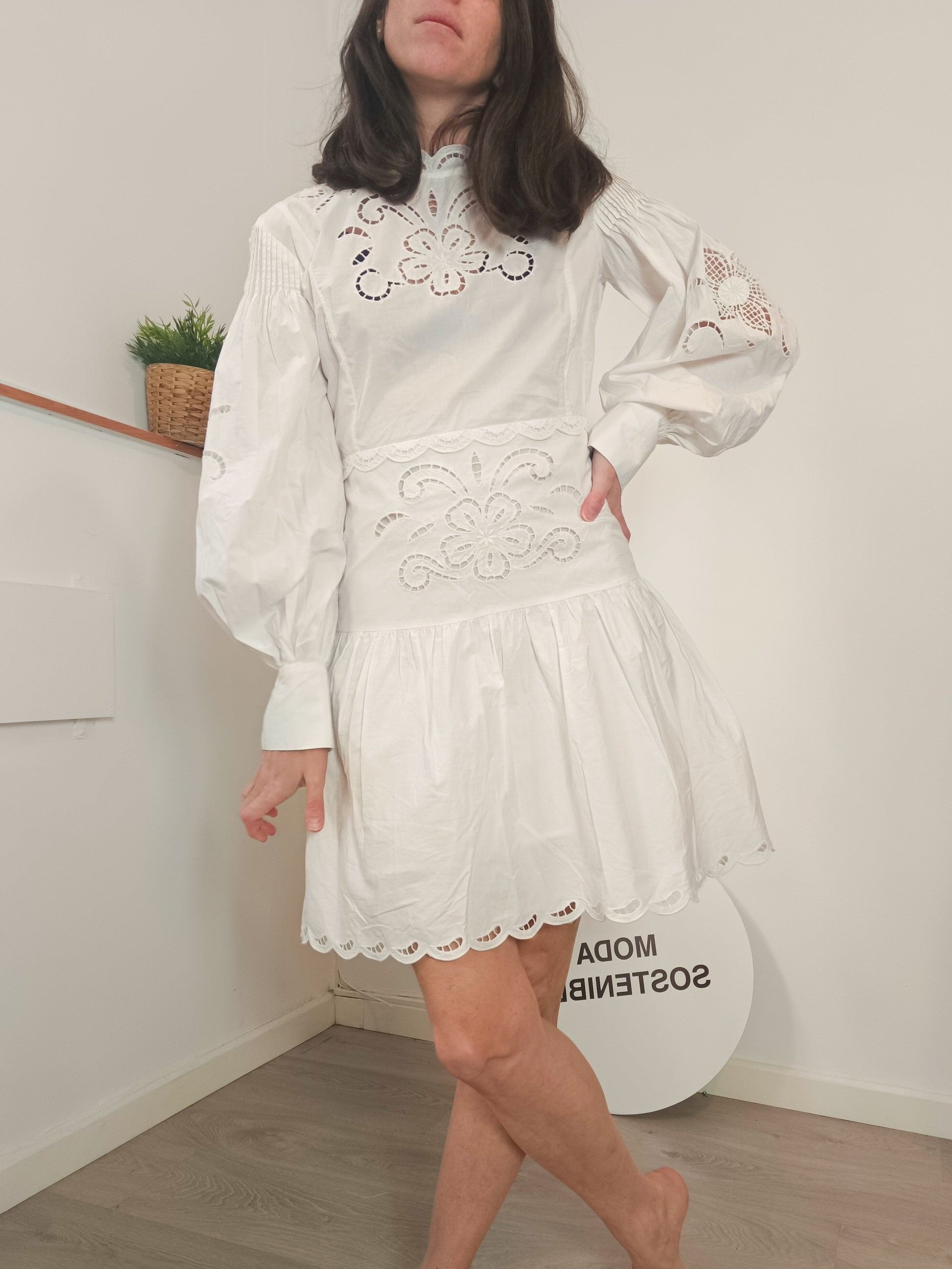 vestido blanco troquelado. Largo 86cm, cintura 35cm no elastico