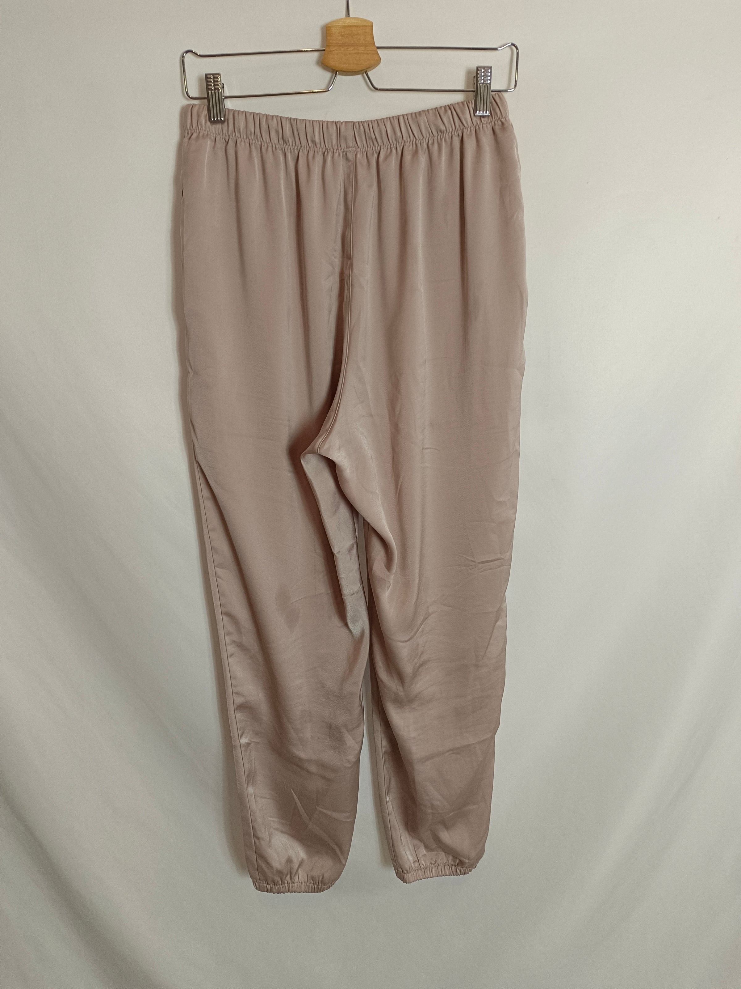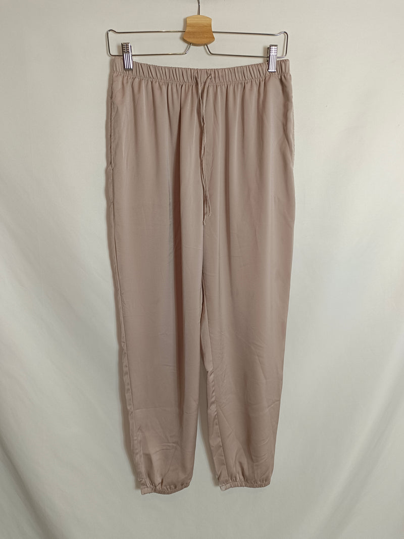 Pantalón beige de tejido satinado. Cintura y tobillo elástico.