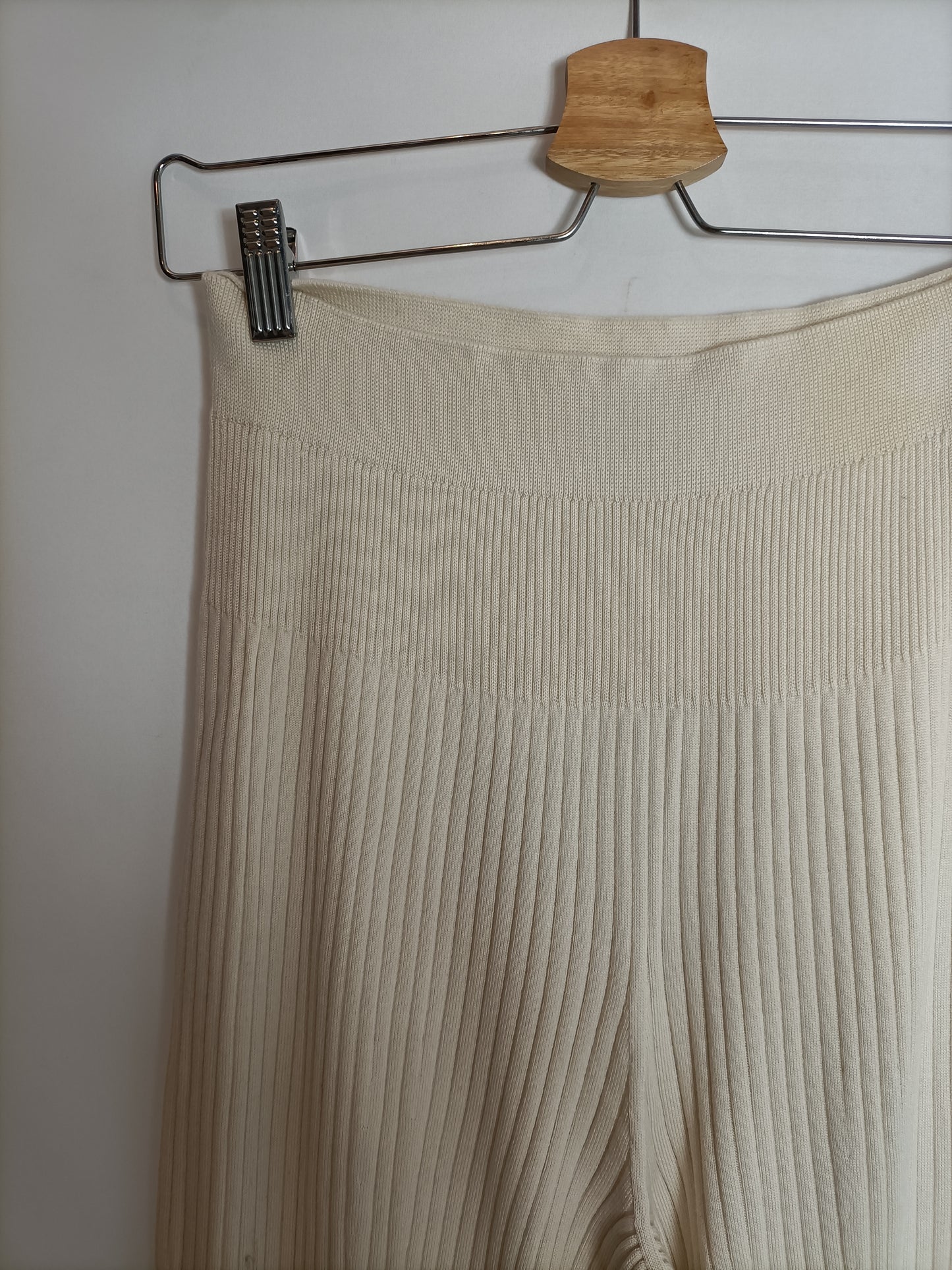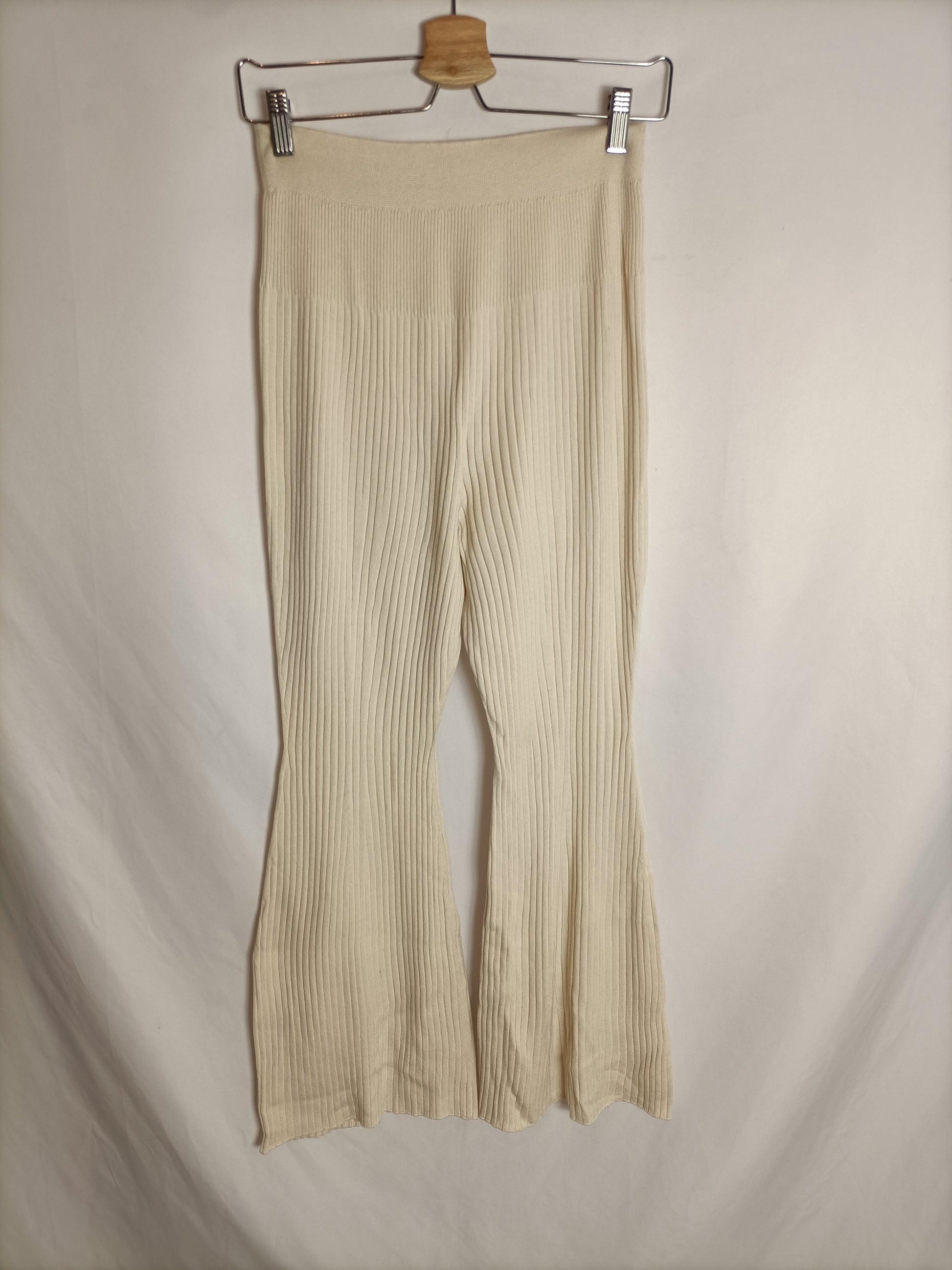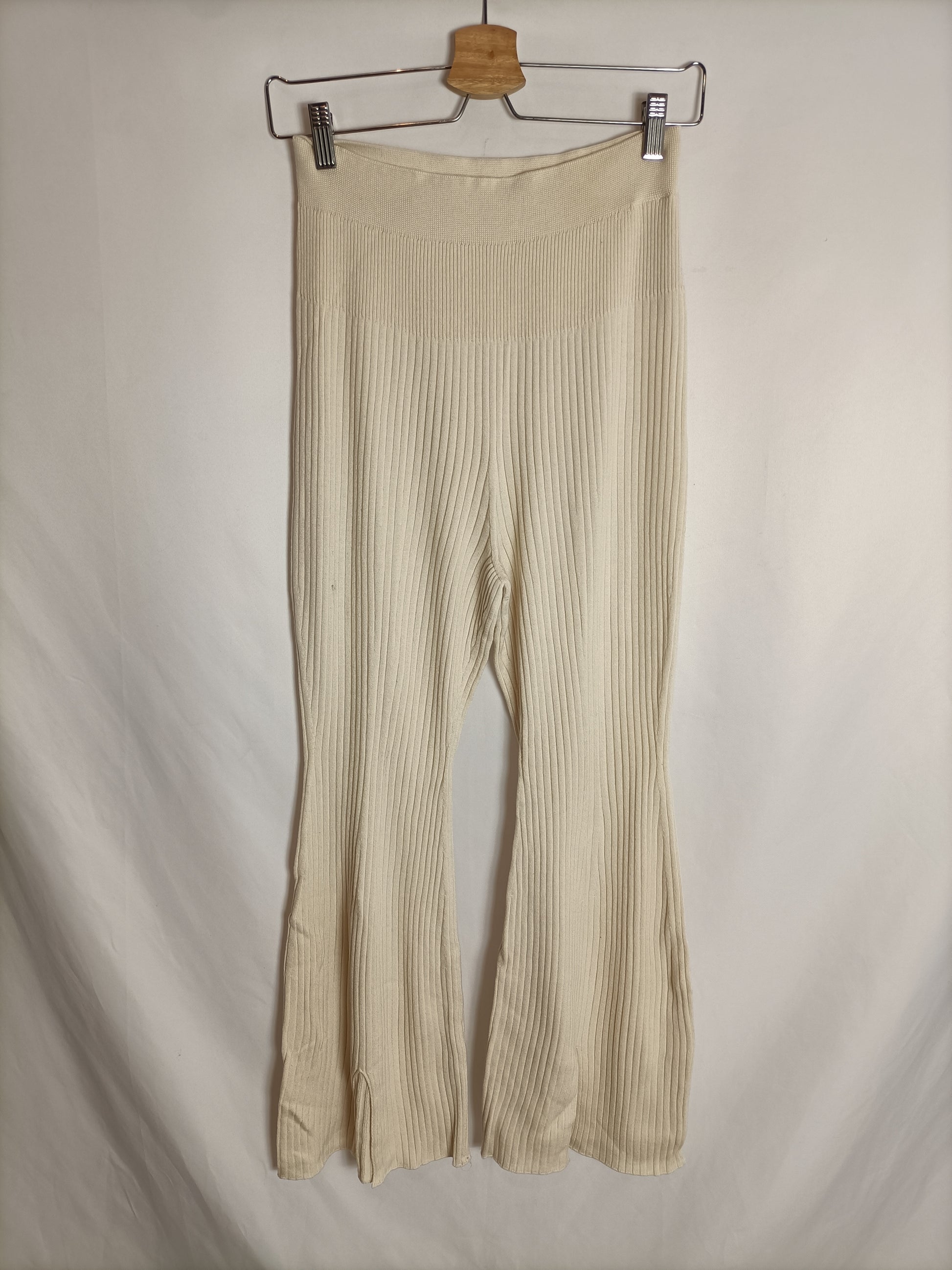 Pantalón beige de punto de canalé elástico.