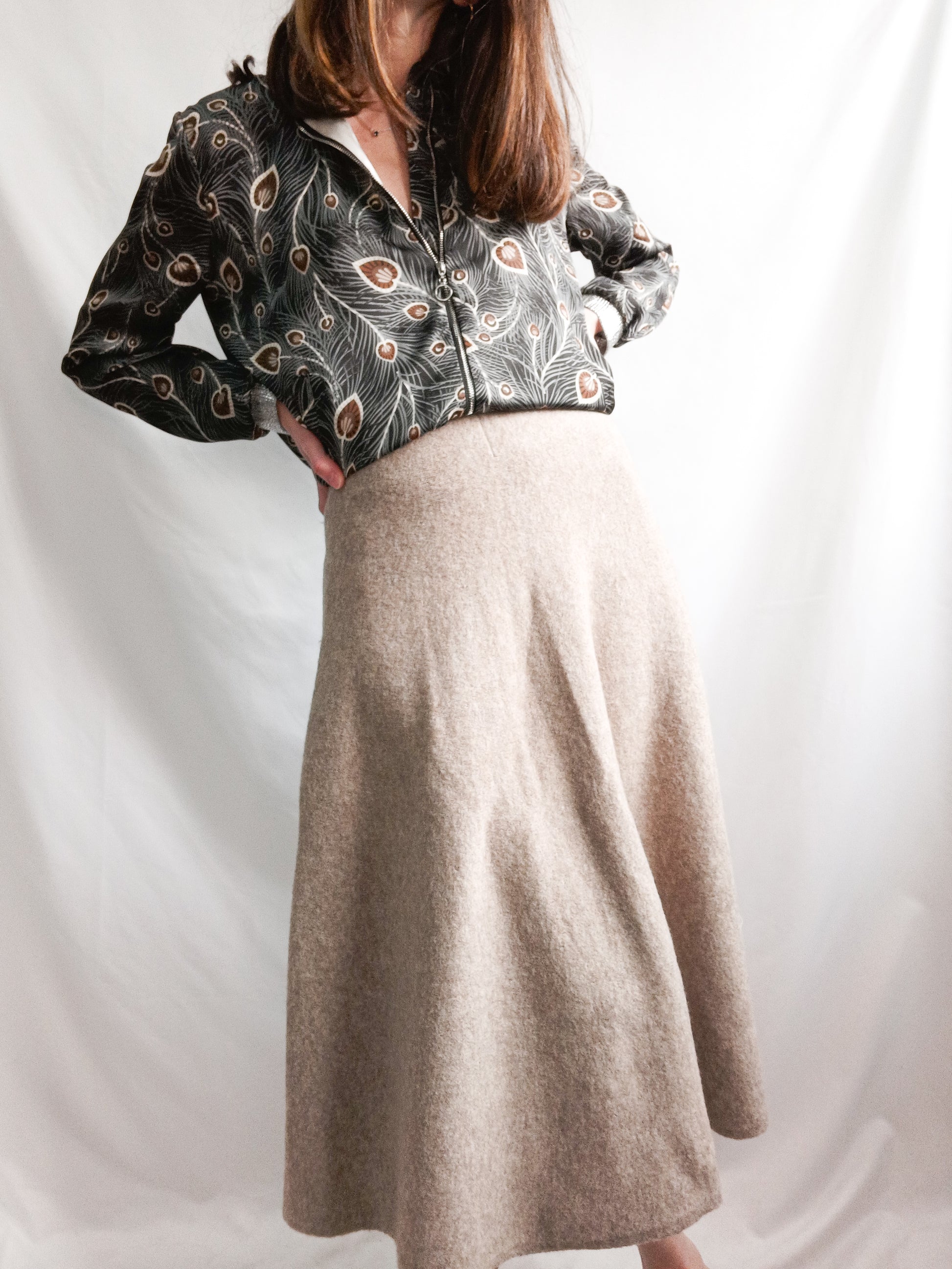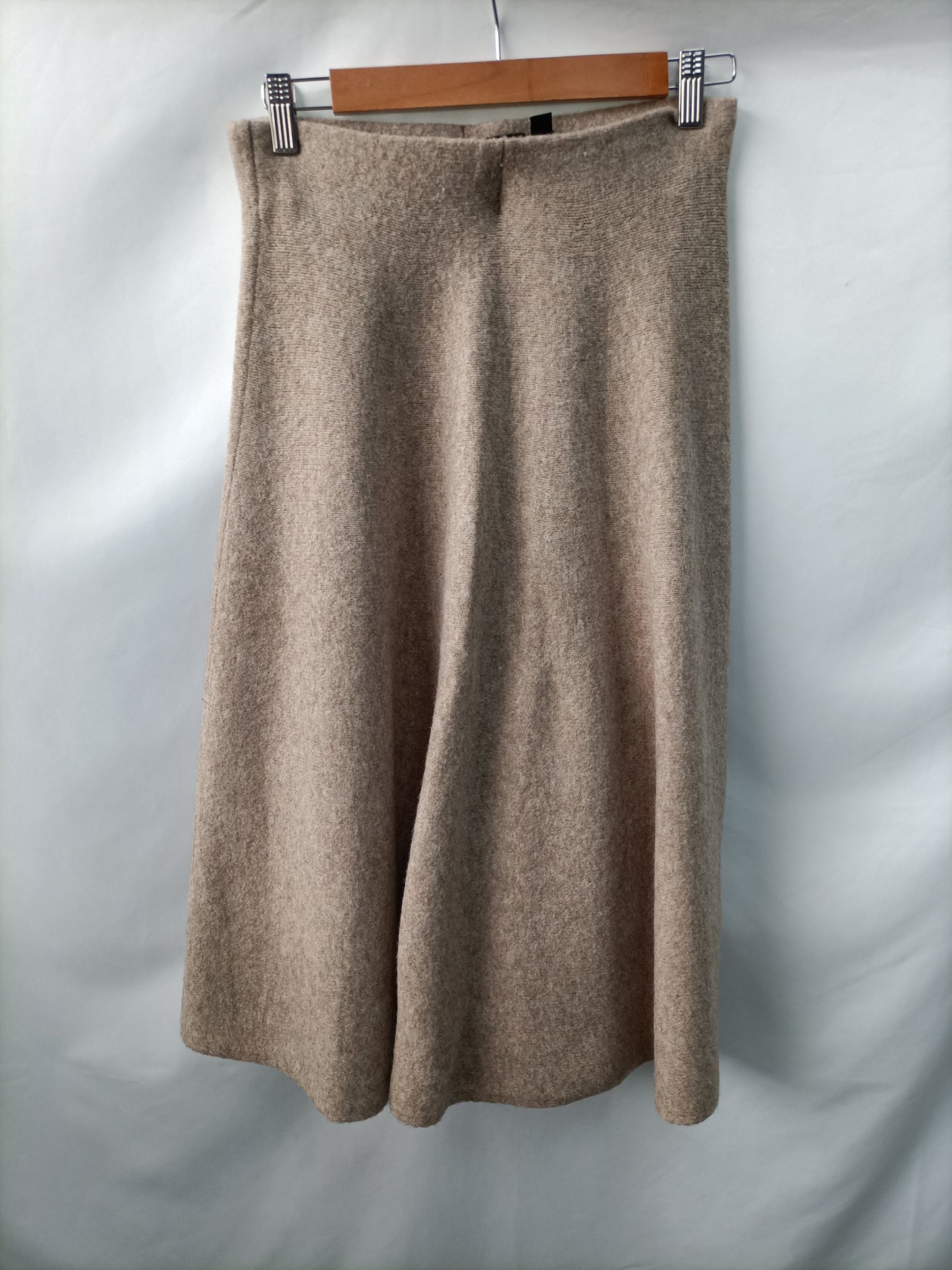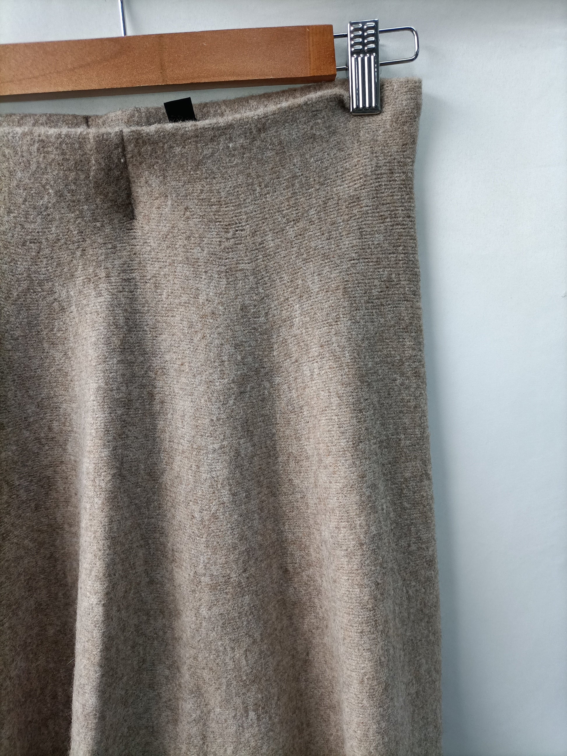 Falda midi beige de punto con movimiento. elástica. Largo 75 cm
