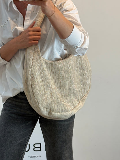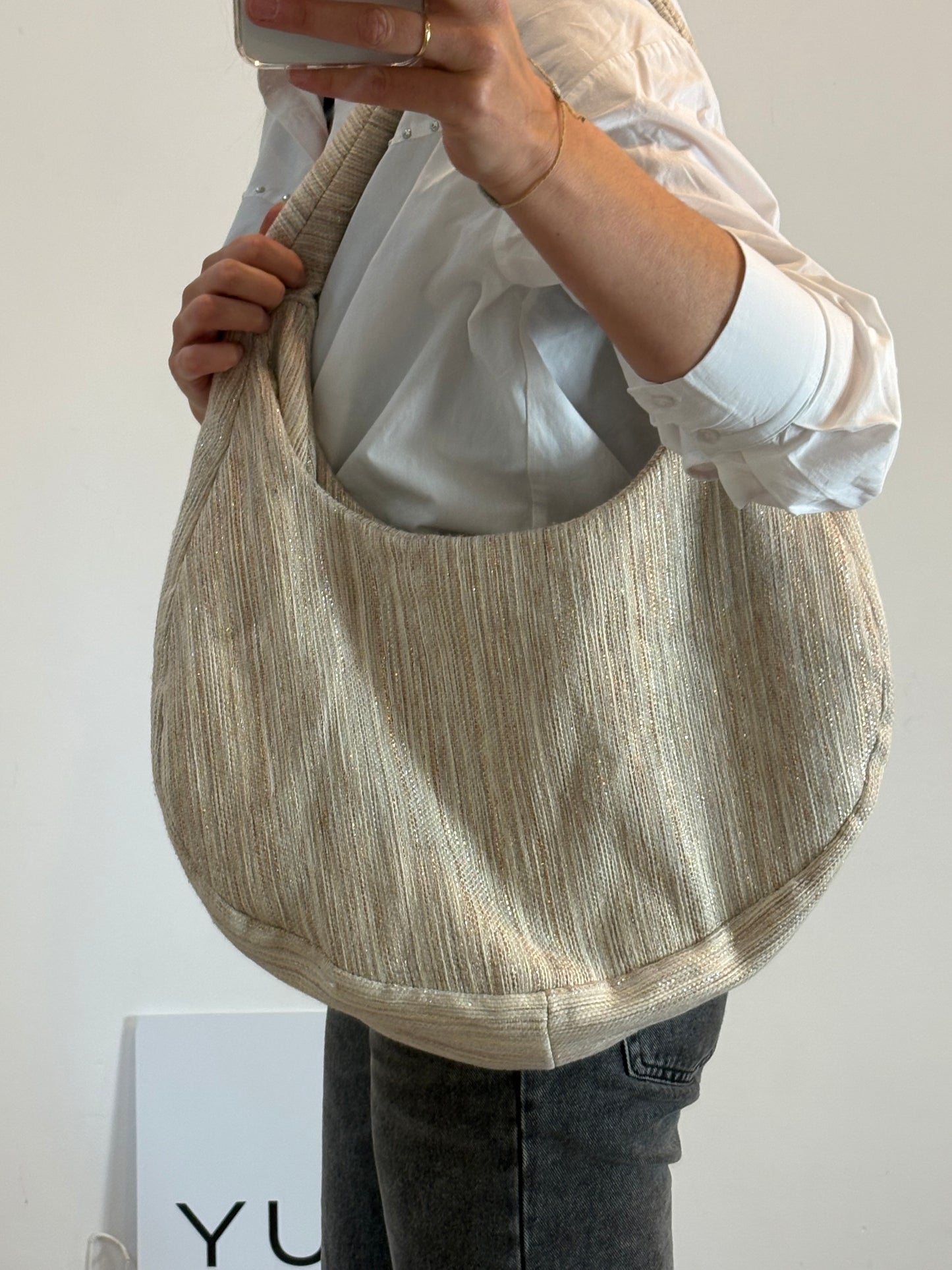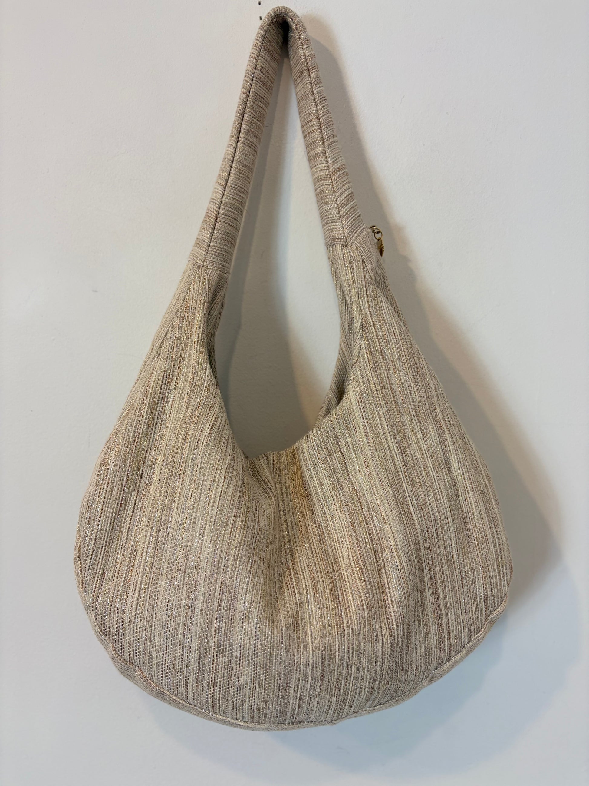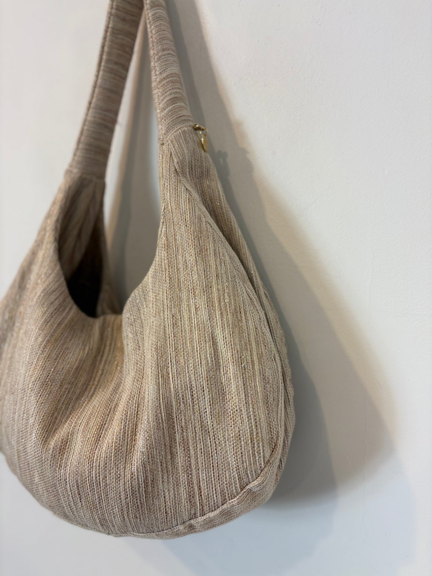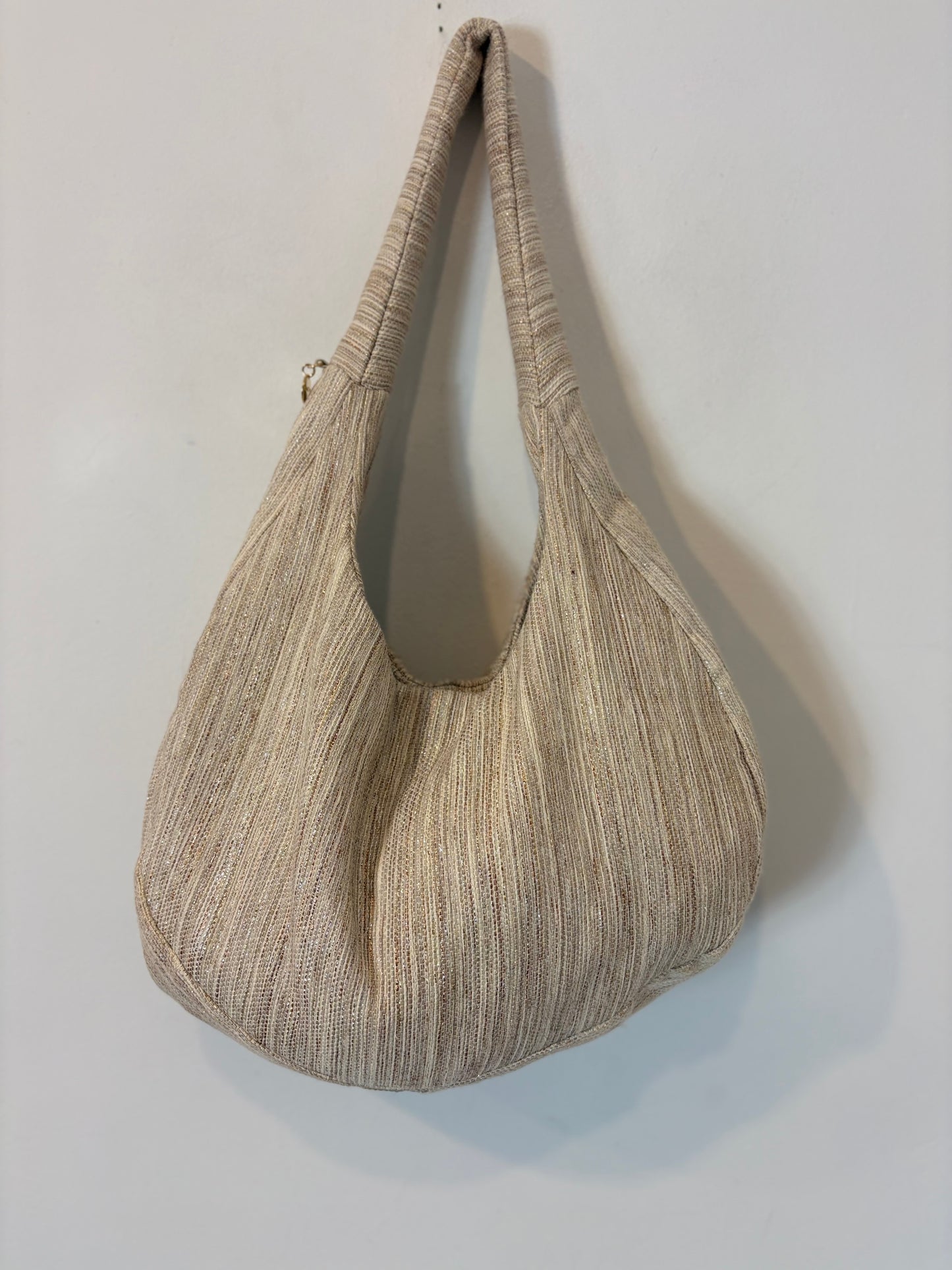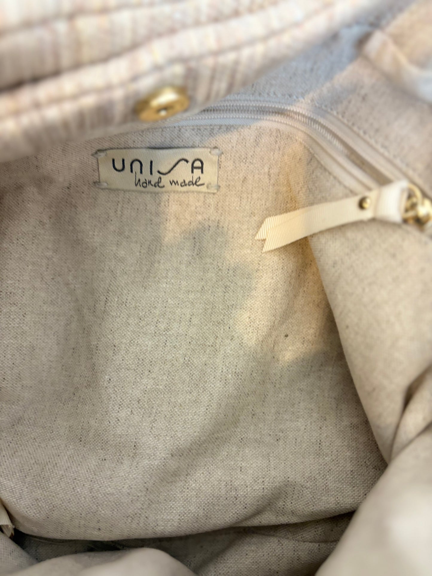Bolso beige tela. alto 29 cm, ancho 49 cm