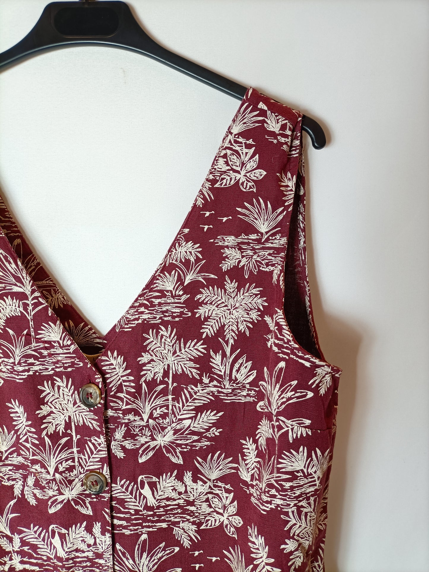 top burdeos con flores blanca de lino y algodón. Botones de nacar.
