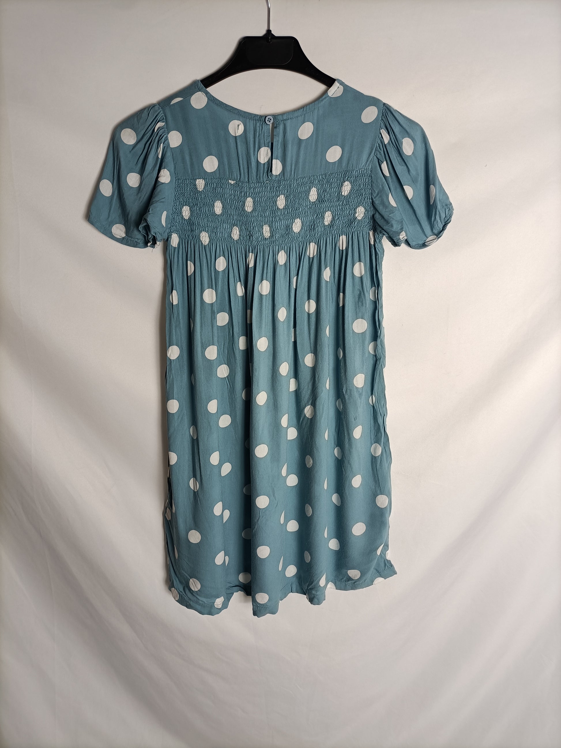 vestido corto azul con lunares blancos. Parte de arriba elástica de nido de abeja