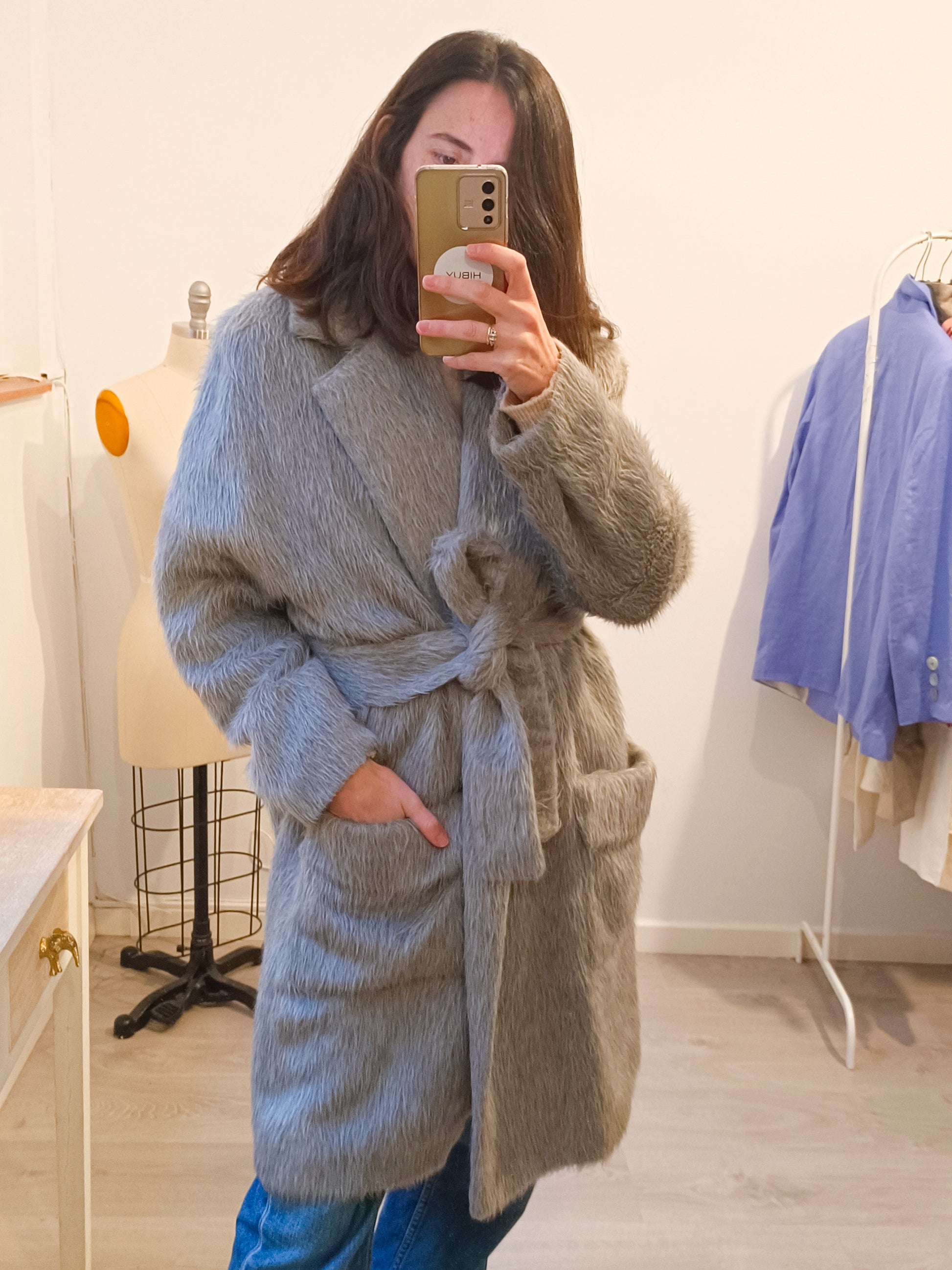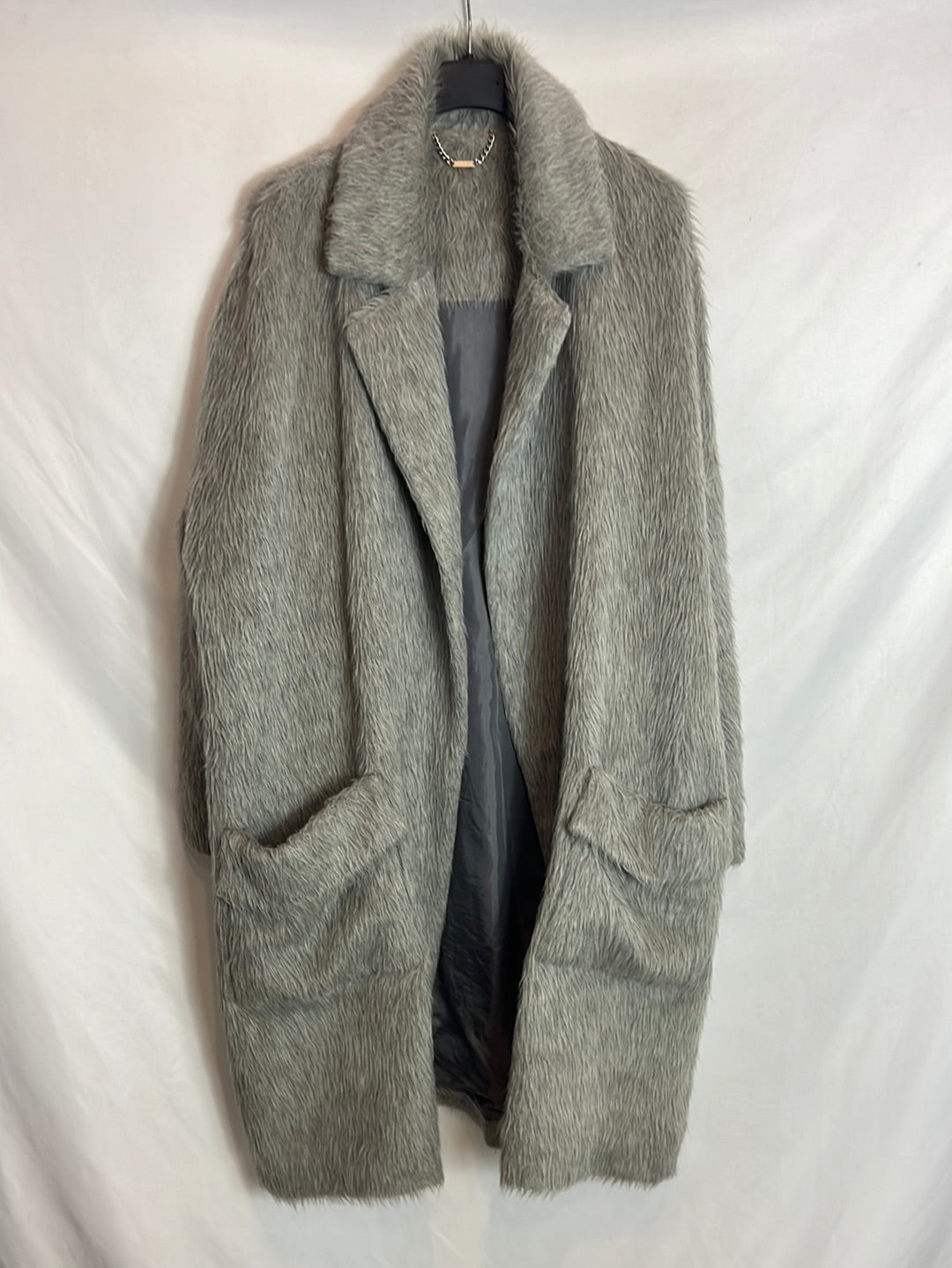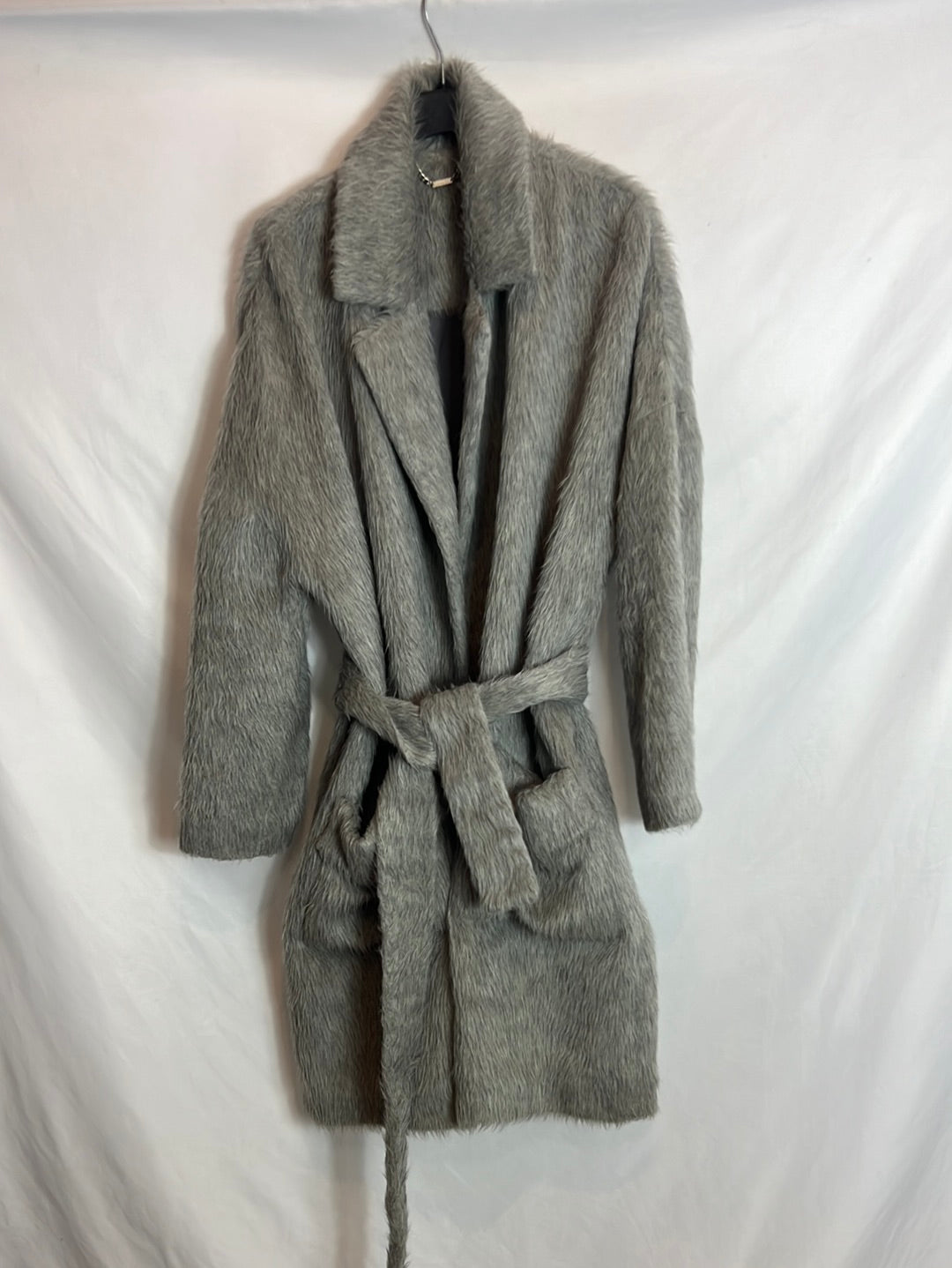 Abrigo pelo gris cinturón. T M Largo 98cm. Tara: bolsillos un poco descosidos