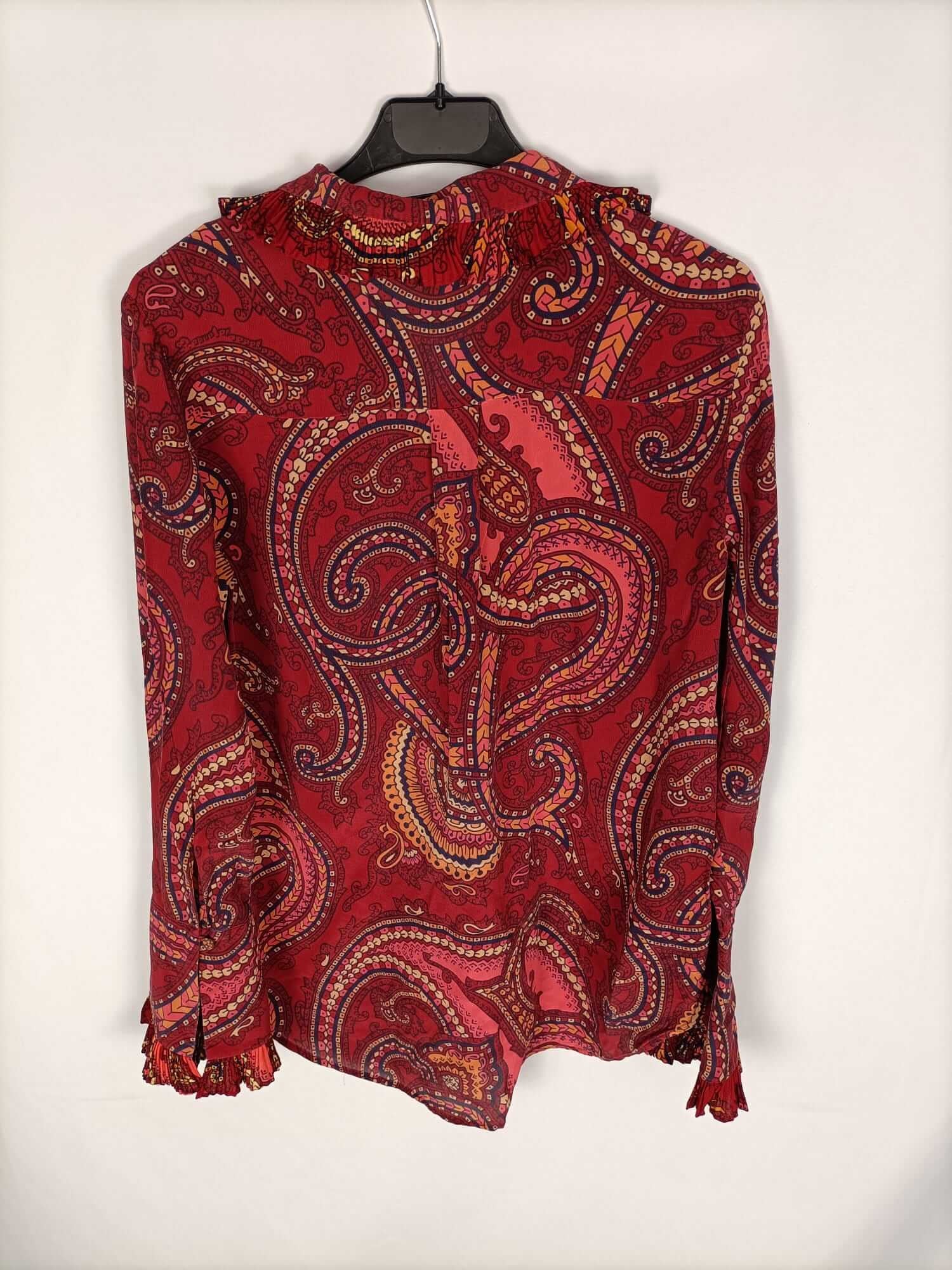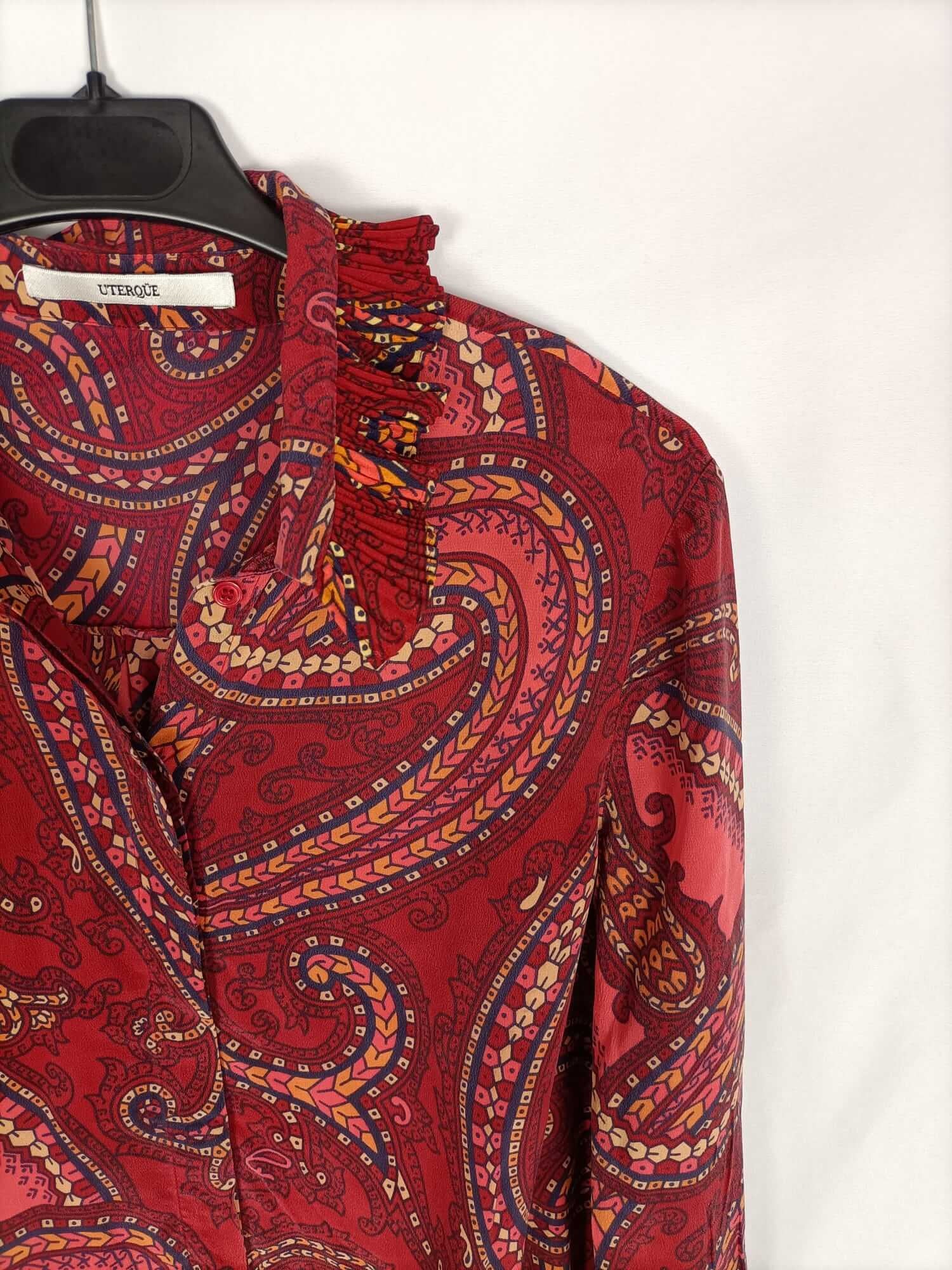 Uterque. Camisa fluida y fina estampado de amebas en tonos burdeos. Volante en el cuello y mangas. De sisa a sisa 53 cm largo 74 cm