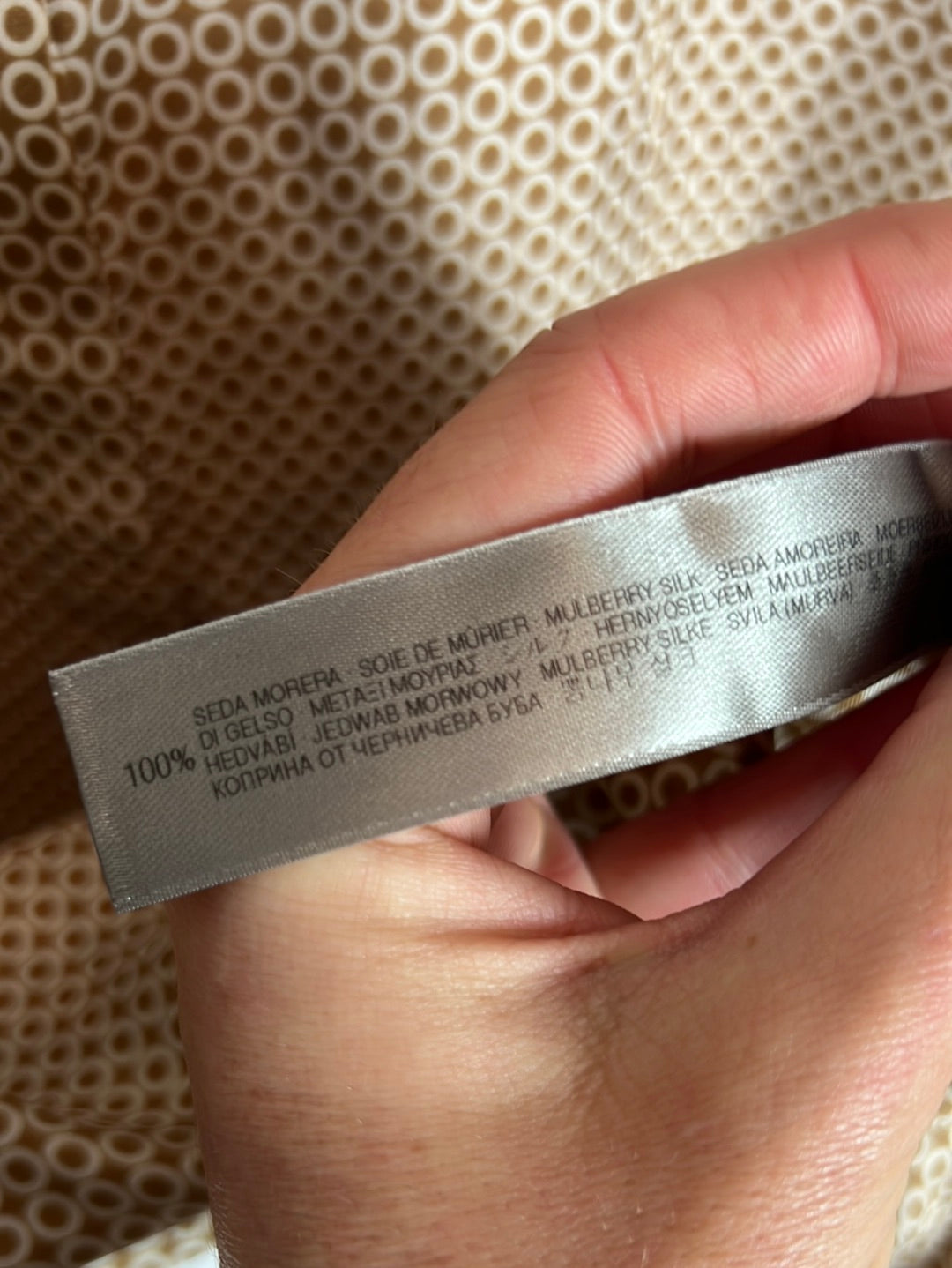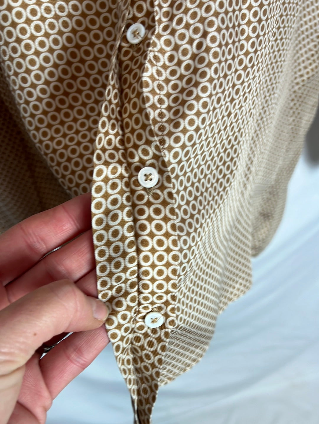 Blusa 100% seda en beige oscuro círculos en color crudo. Hombros 41cm, largo 74cm