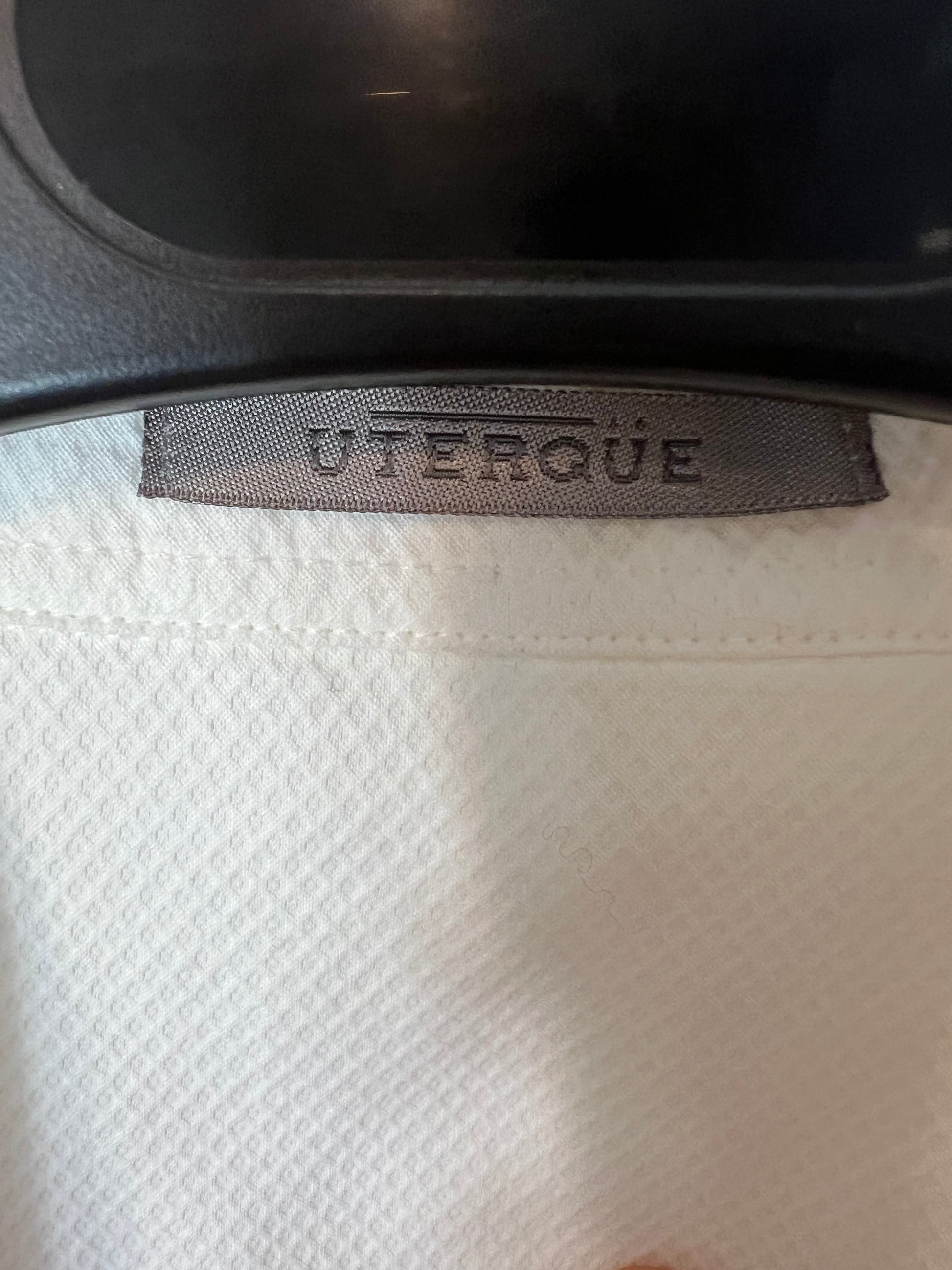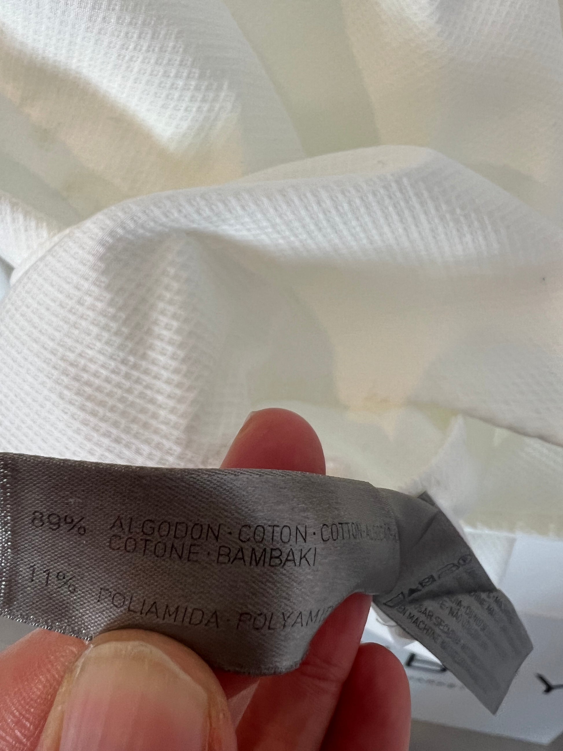 Camisa blanca piqué. Hombros 38cm, de sisa a sisa 44cm, largo 68cm