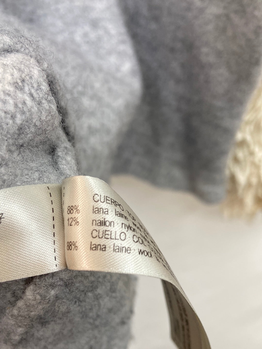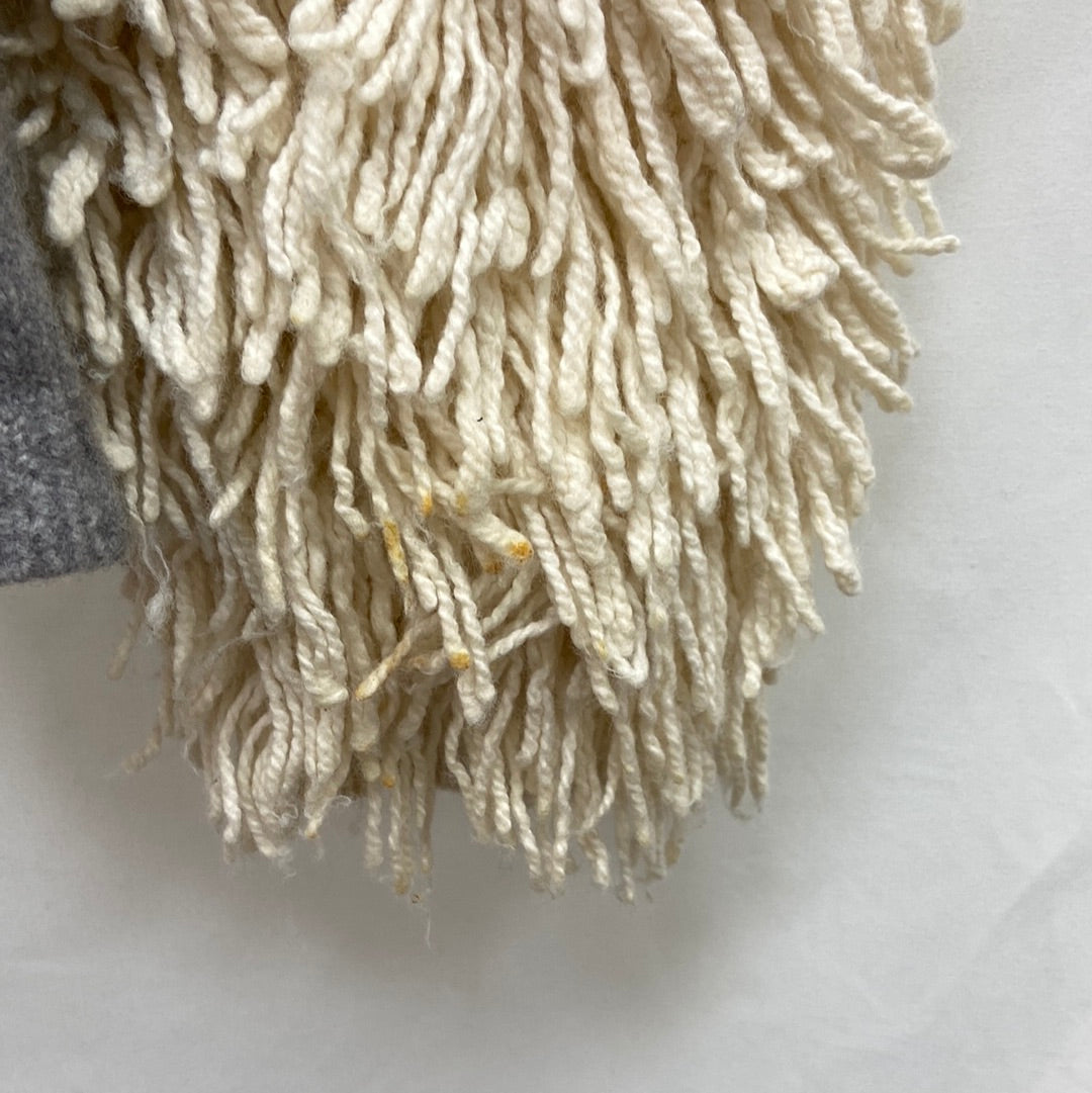 Jersey de lana gris y beis con mangas de flecos. Tipo borrego TARA: Tiene algunas zonas de los flecos. Algo manchadas .