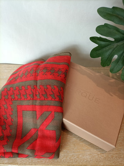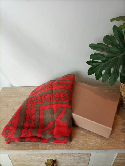 NUEVO CON ETIQUETA. pañuelo de lana marrón y naranja con estampado de pata de gallo